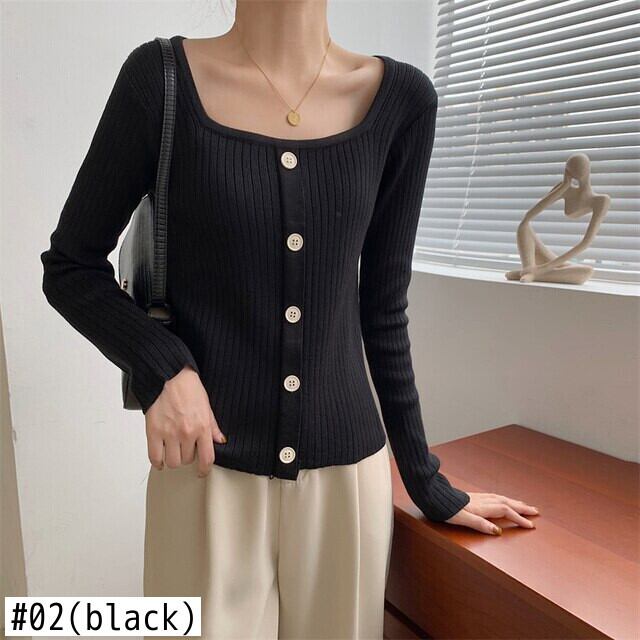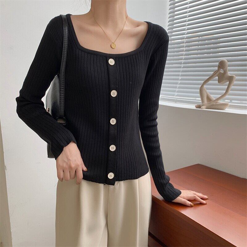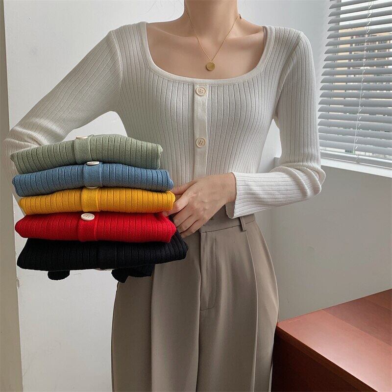 LJSXLS 2021 秋冬スリムニットプルオーバートップスワンブレストスクエアネック長袖無地セーター女性服プル ロング オータム 秋物 ウィンター 冬物 ソリッドカラー スクウェア Son72068312301