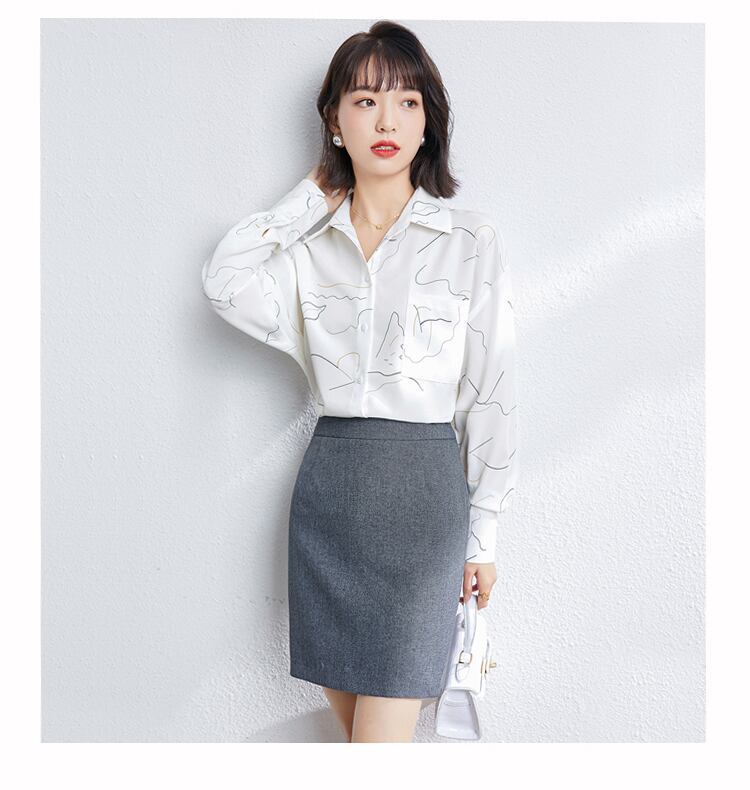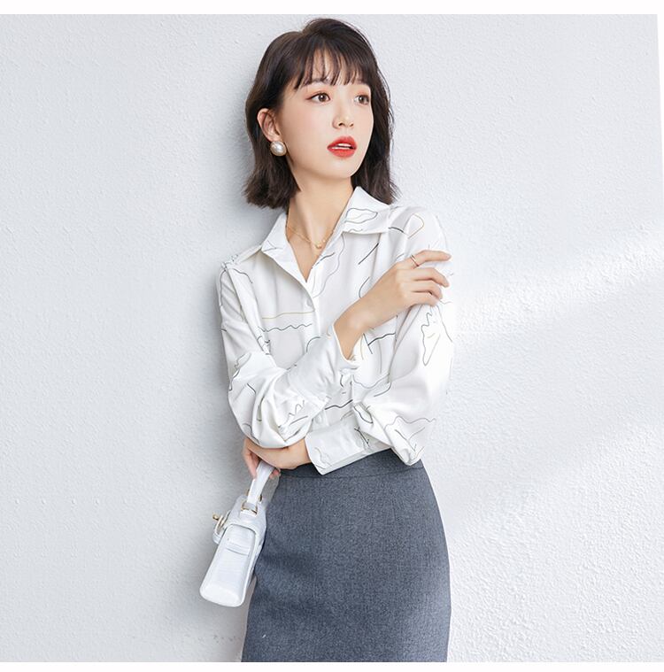 2022 秋プリントブラウス女性長袖ポロネック白シャツオフィスレディ Y ロング ホワイト オータム 秋物 Oネック 会社 学校 通勤や通学にも Son82577343785