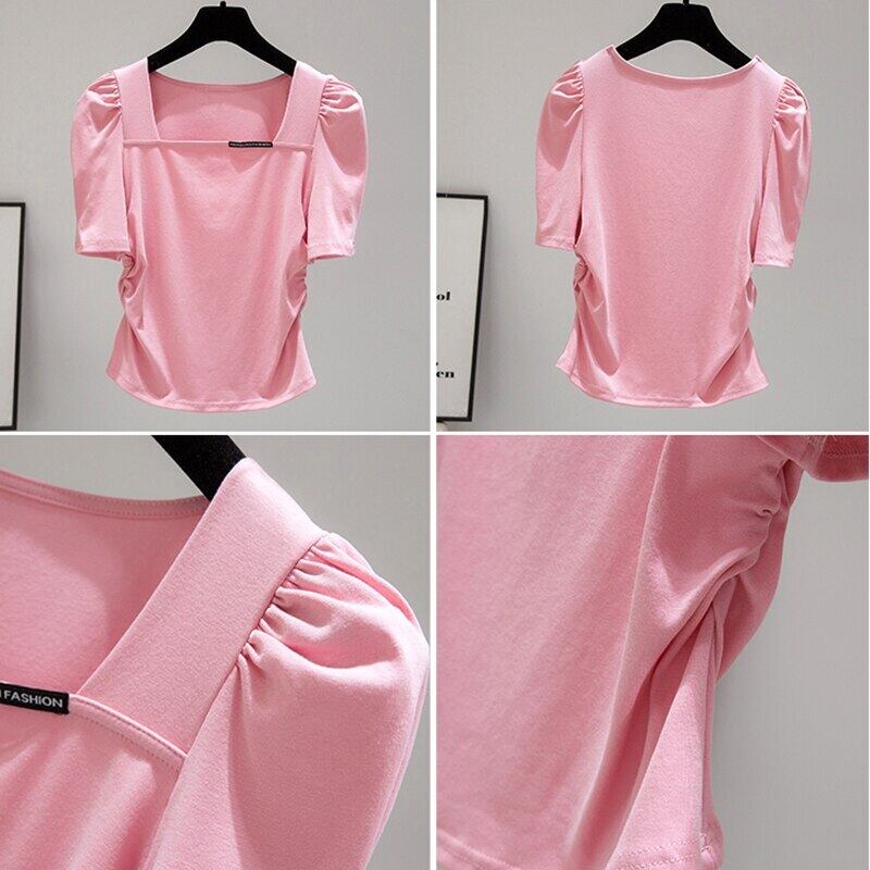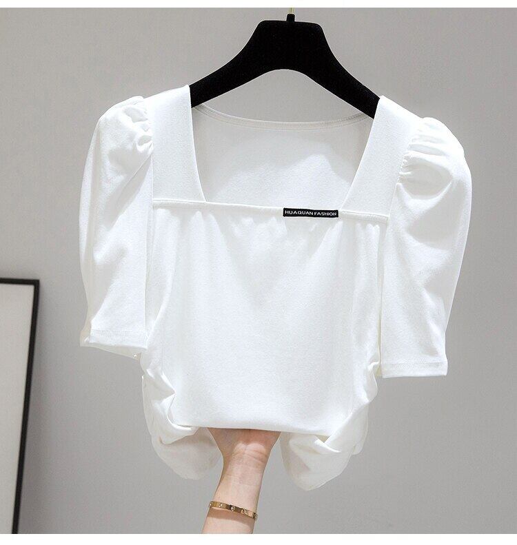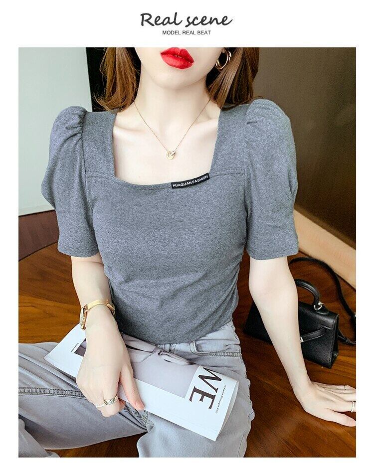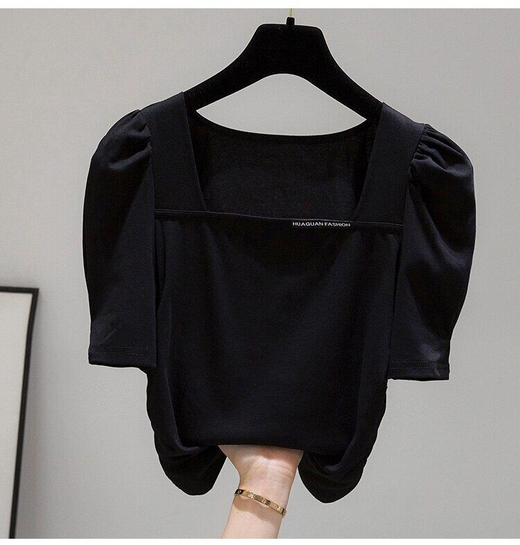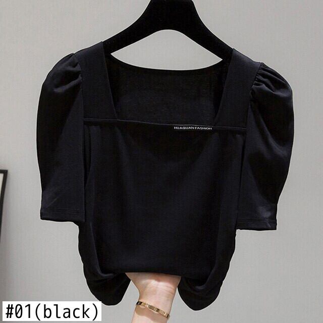 LJSXLS 黒服コットン Tシャツ女性 2021 夏トップスクエアカラー半袖女性の Tシャツスリム Tシャツ ショート ブラック ハーフスリーブ サマー 夏物 スクウェア Son73966851308