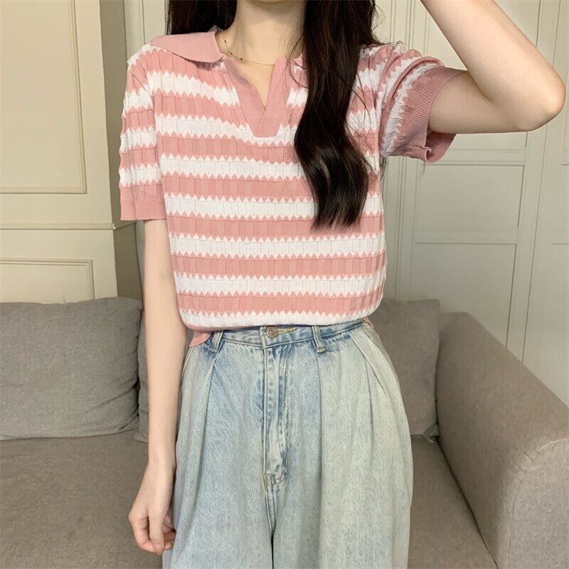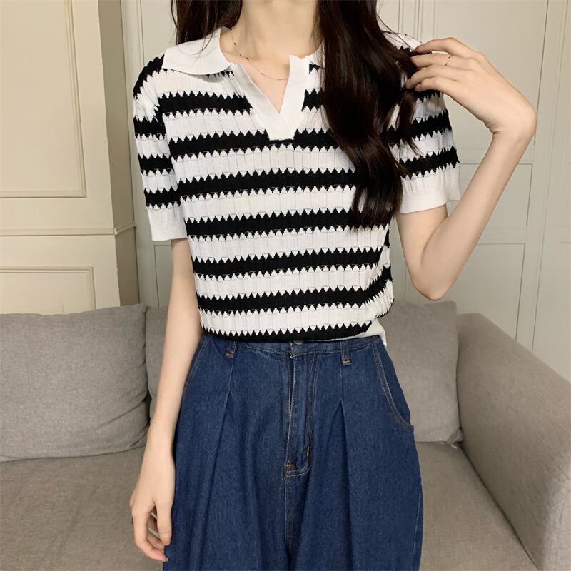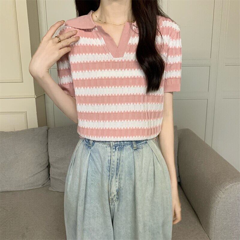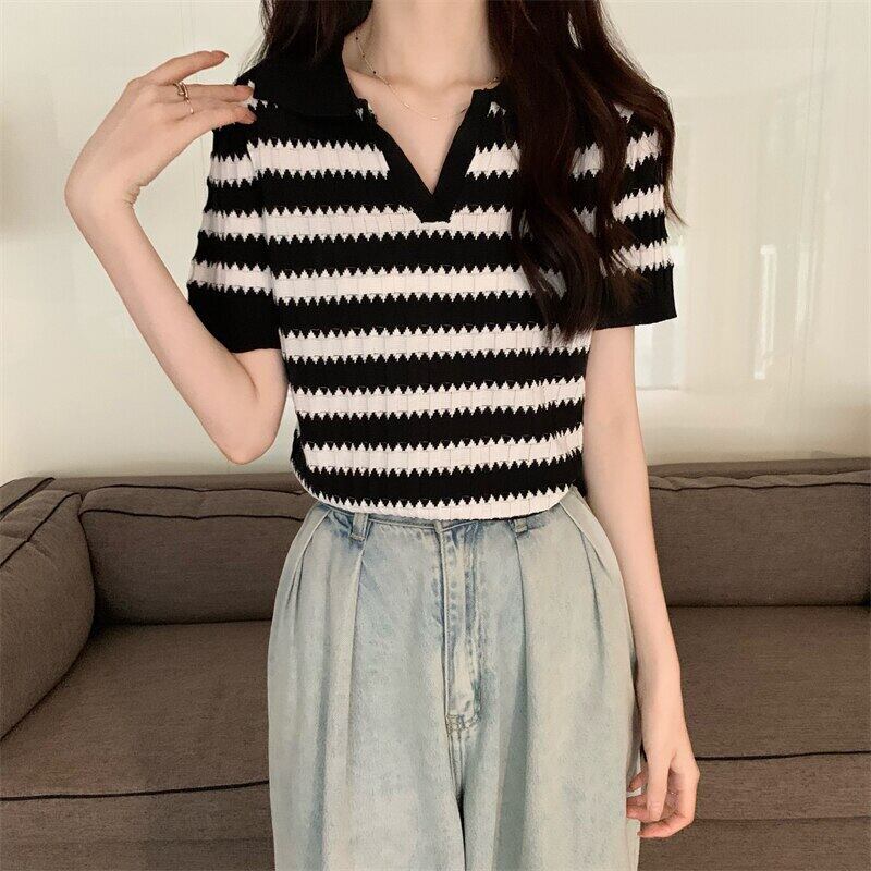 ニット半袖 Tシャツクロップトップ女性ストライプ Tシャツ 2022 夏ターンダウン襟服ニット基本 Tシャツ女性 ショート ハーフスリーブ サマー 夏物 Son2840207345