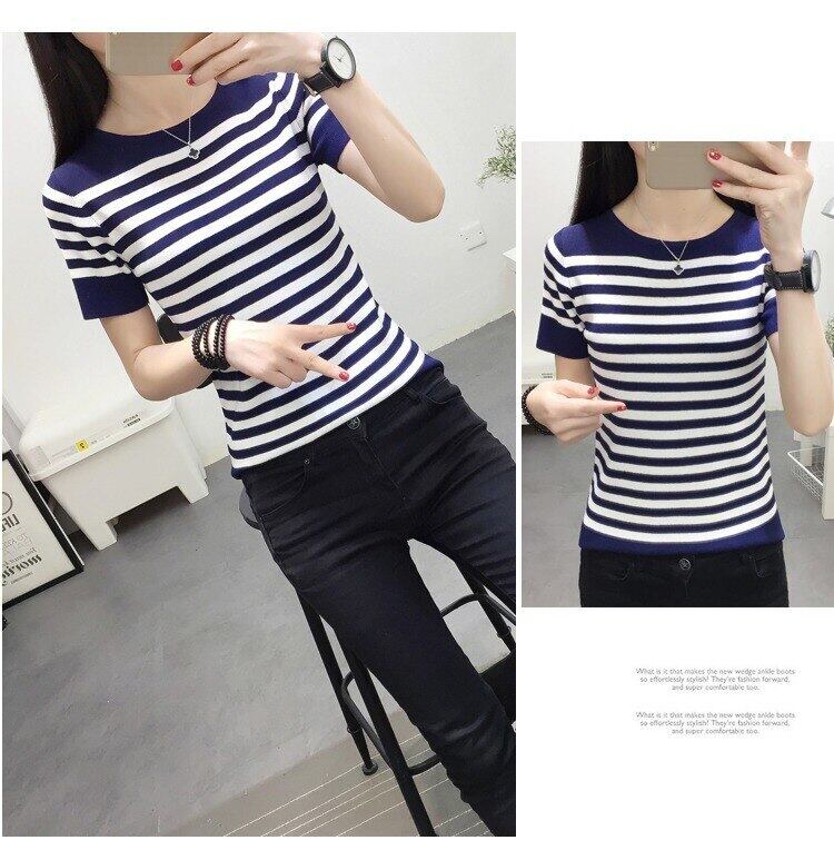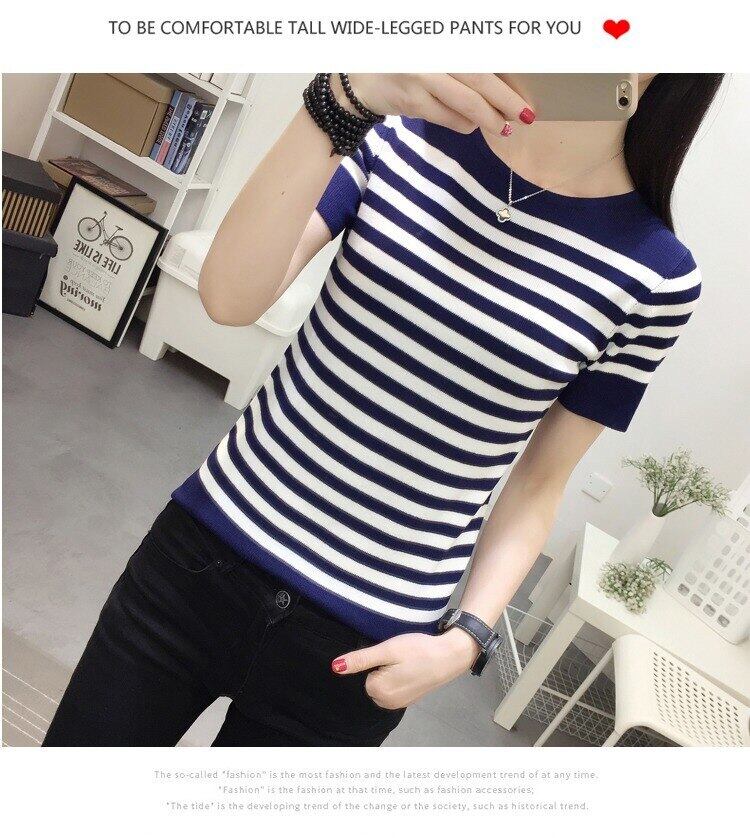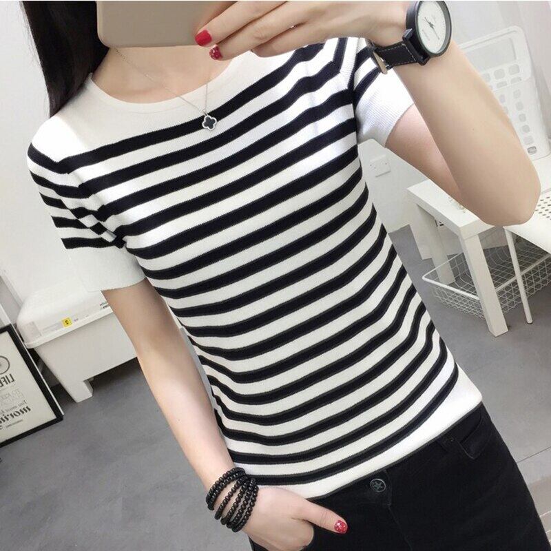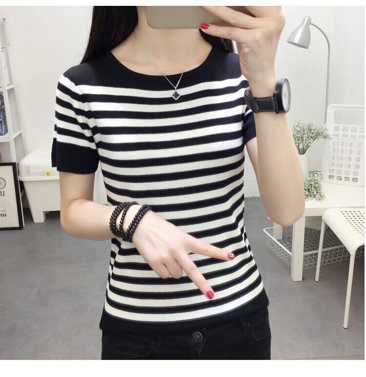 ストライプ半袖 Tシャツ女性ニットトップス夏 2022 コントラストカラー Tシャツ女性弾性 Tシャツ ショート ハーフスリーブ エラスティック 伸縮 サマー 夏物 Son73505973337