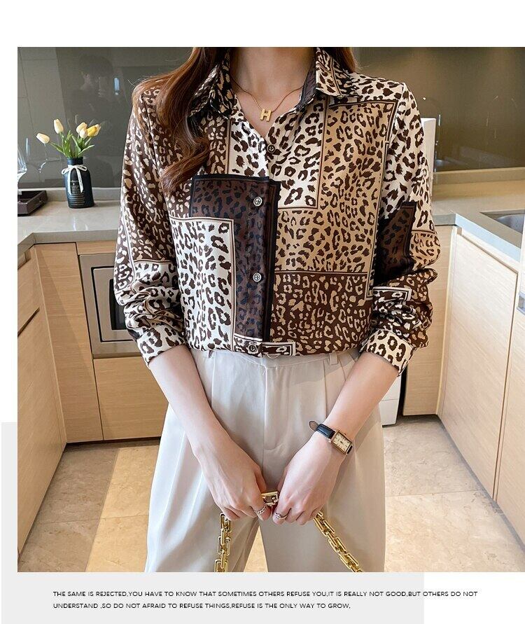2022 春秋のヒョウレディーストップスとブラウスターンダウン襟長袖ブラウス女性シフォン ロング スプリング 春物 オータム 秋物 Son68774965755