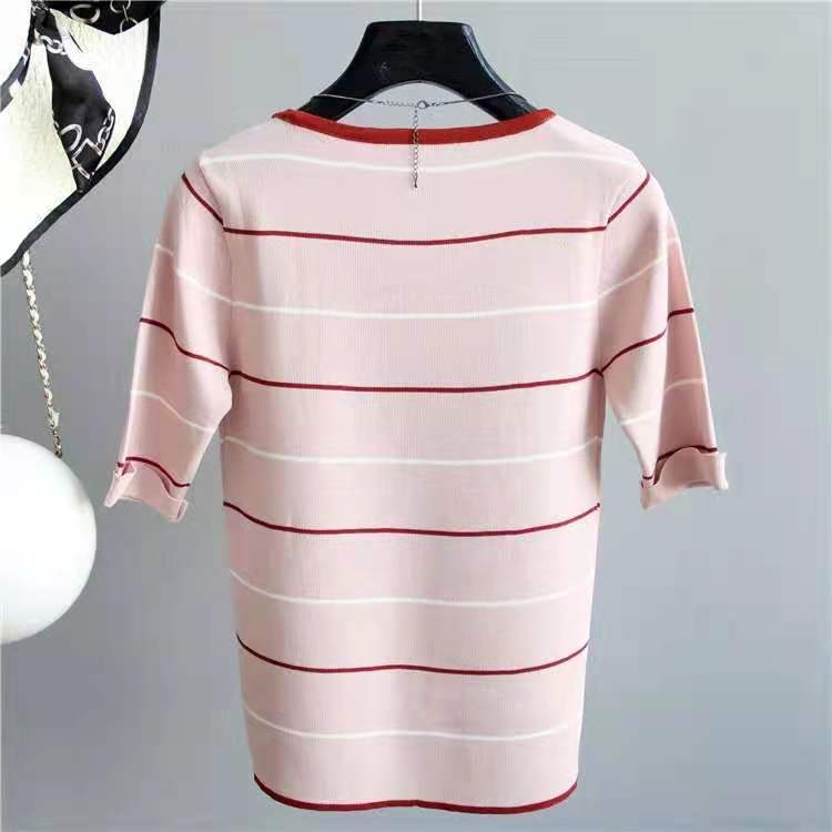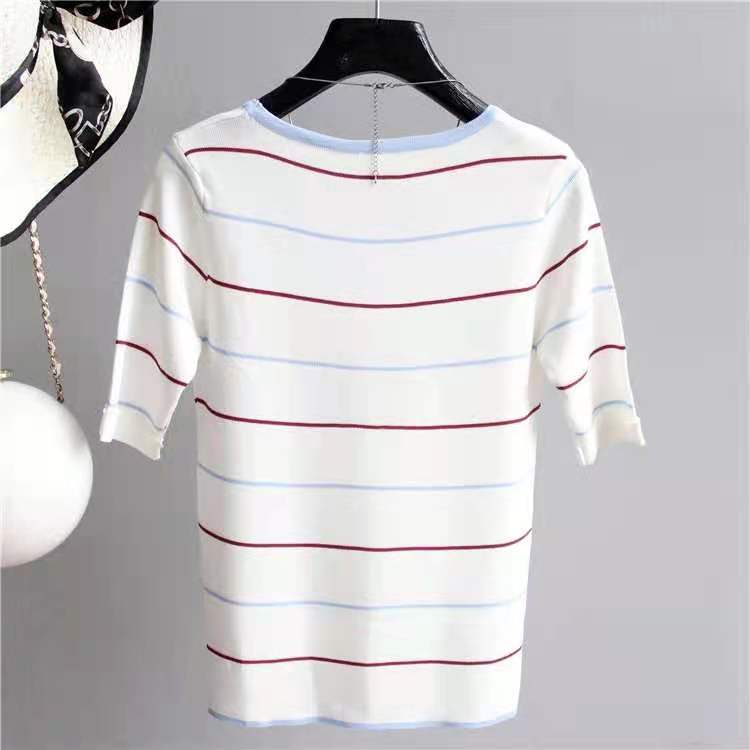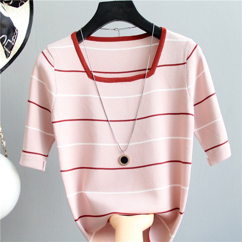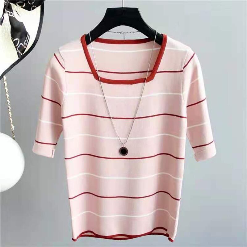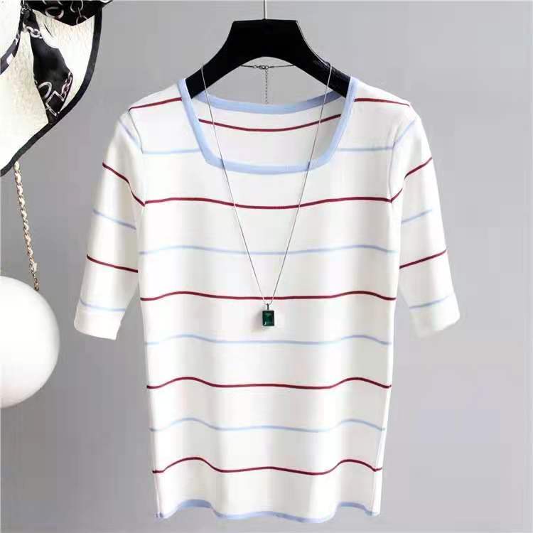 LJSXLS 2022 夏ストライプスクエアカラー Tシャツ女性薄型ニット半袖トップス Tシャツ Camisetas ショート ハーフスリーブ サマー 夏物 スクウェア Son17024228777