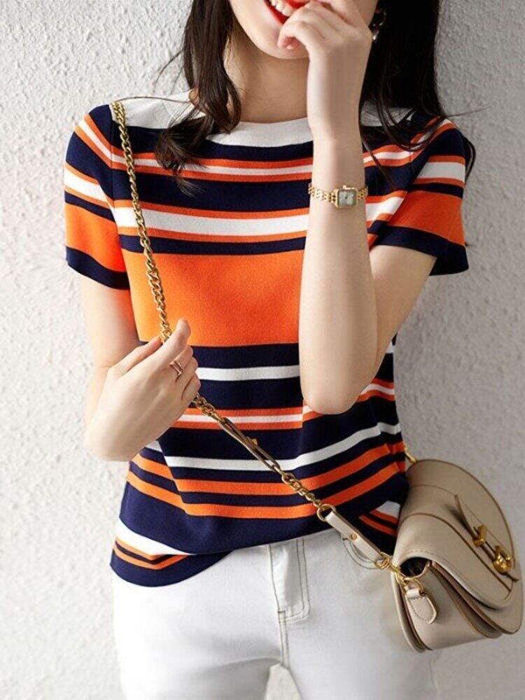 トップストライプ Tシャツ女性の夏の Tシャツ 2022 コントラストカラートップスニット服半袖 Tシャツ Camisetas ショート ハーフスリーブ サマー 夏物 Son48158413145