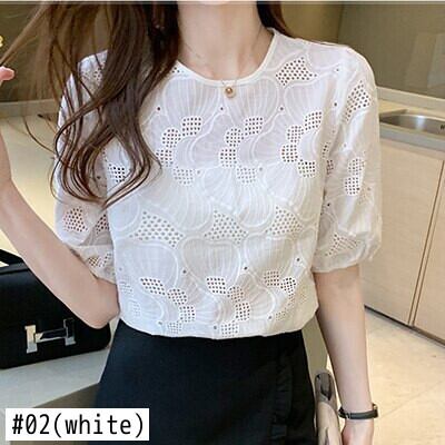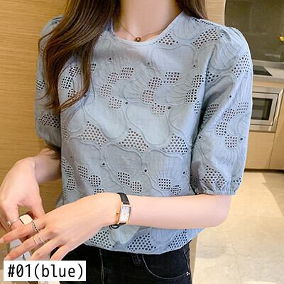 LJSXLS 夏刺繍中空アウト半袖シャツ女性全試合プルオーバーブラウスブルー女性トップス レッド ハーフスリーブ サマー 夏物 Son49090833117