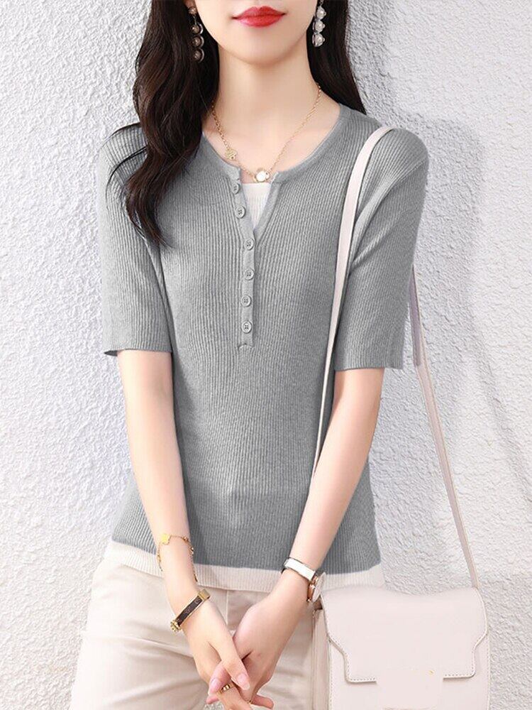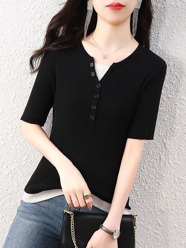 Tシャツフェイクツーピーストップ女性ニット V ネック半袖 Tシャツ夏ボタン婦人服 2022 Tシャツ ショート ハーフスリーブ サマー 夏物 Vネック Son22136264742