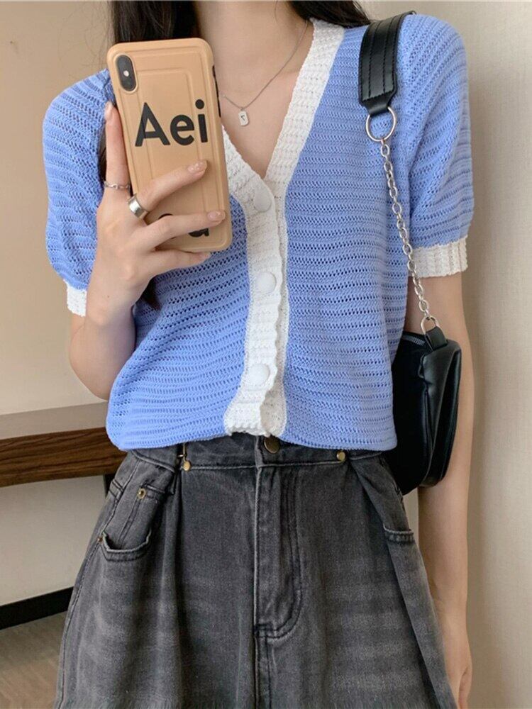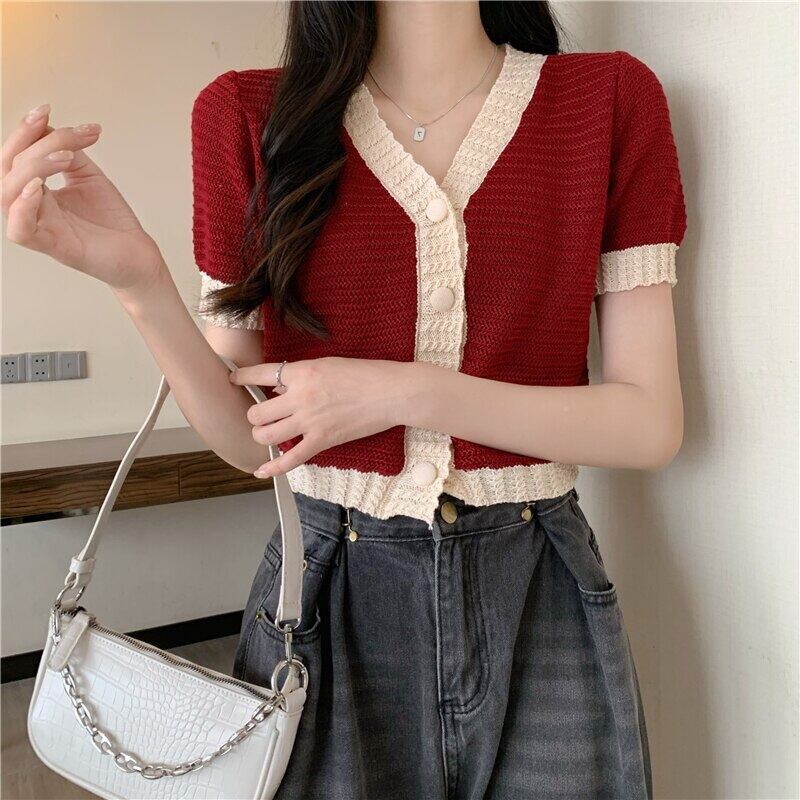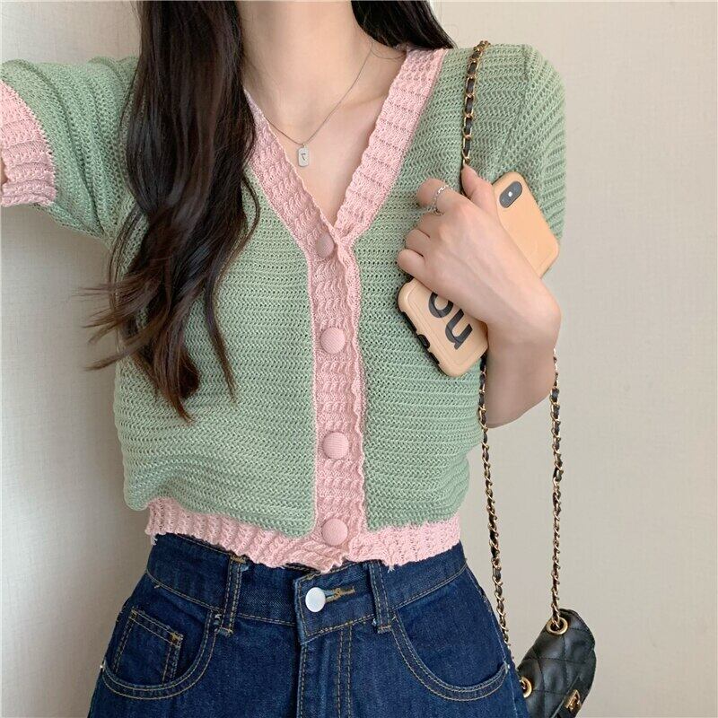 ニットクロップトップセーター 2022 夏薄型カーディガン女性セーターボタン半袖トップス服 Vetement ショート ハーフスリーブ サマー 夏物 Son56654098241