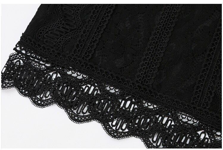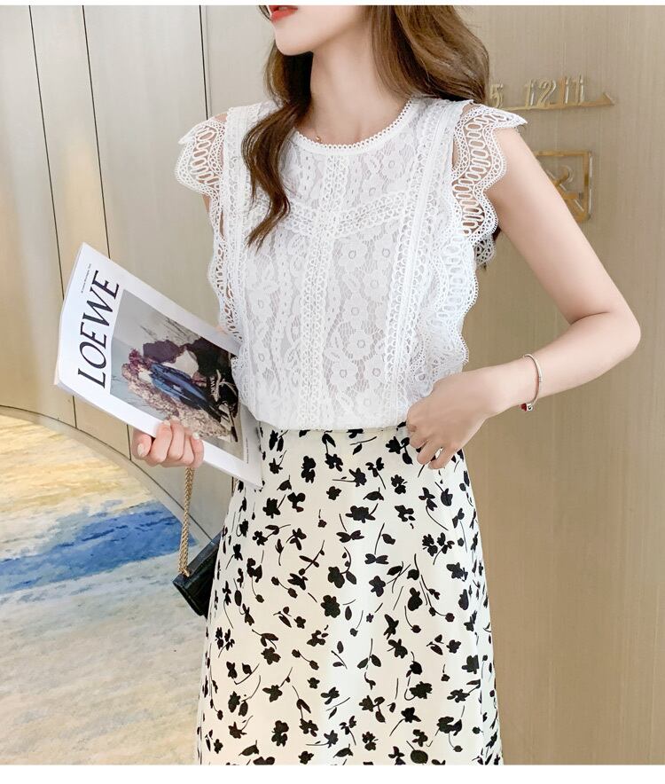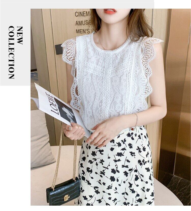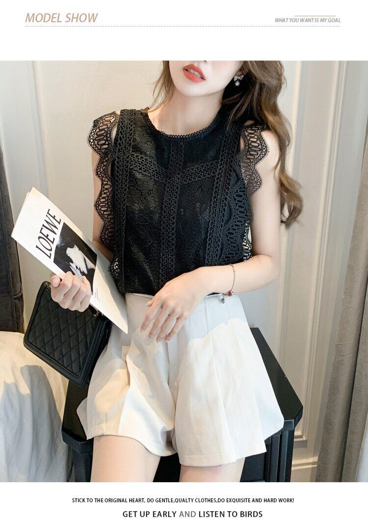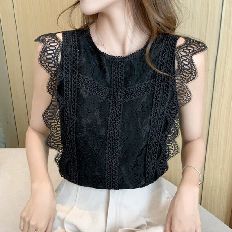 LJSXLS 夏黒レースブラウス女性中空アウト O ネックの女性のシャツオールマッチノースリーブトップソリッドスリムベーシック ブラック サマー 夏物 Oネック ソリッドカラー Son43346598869