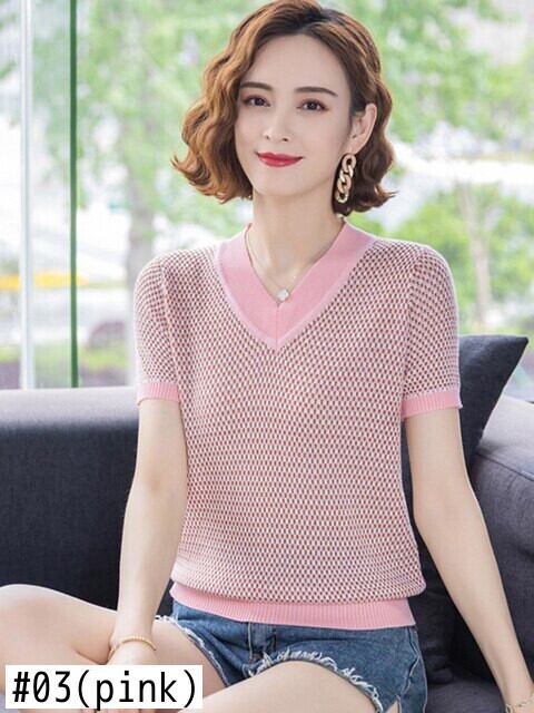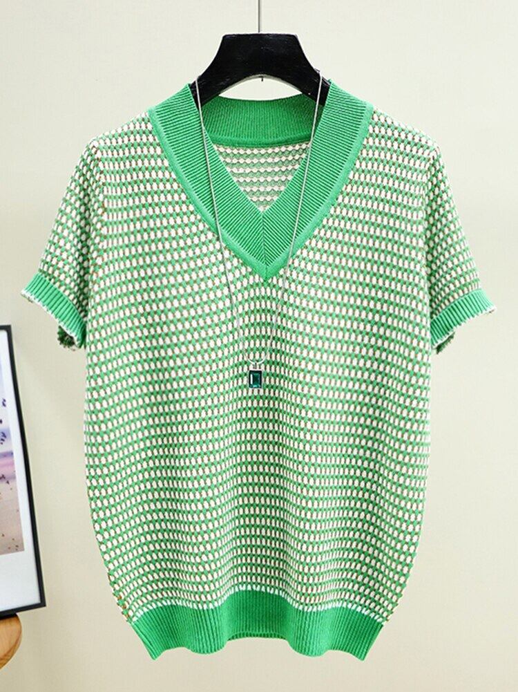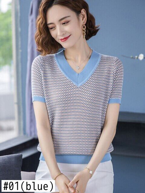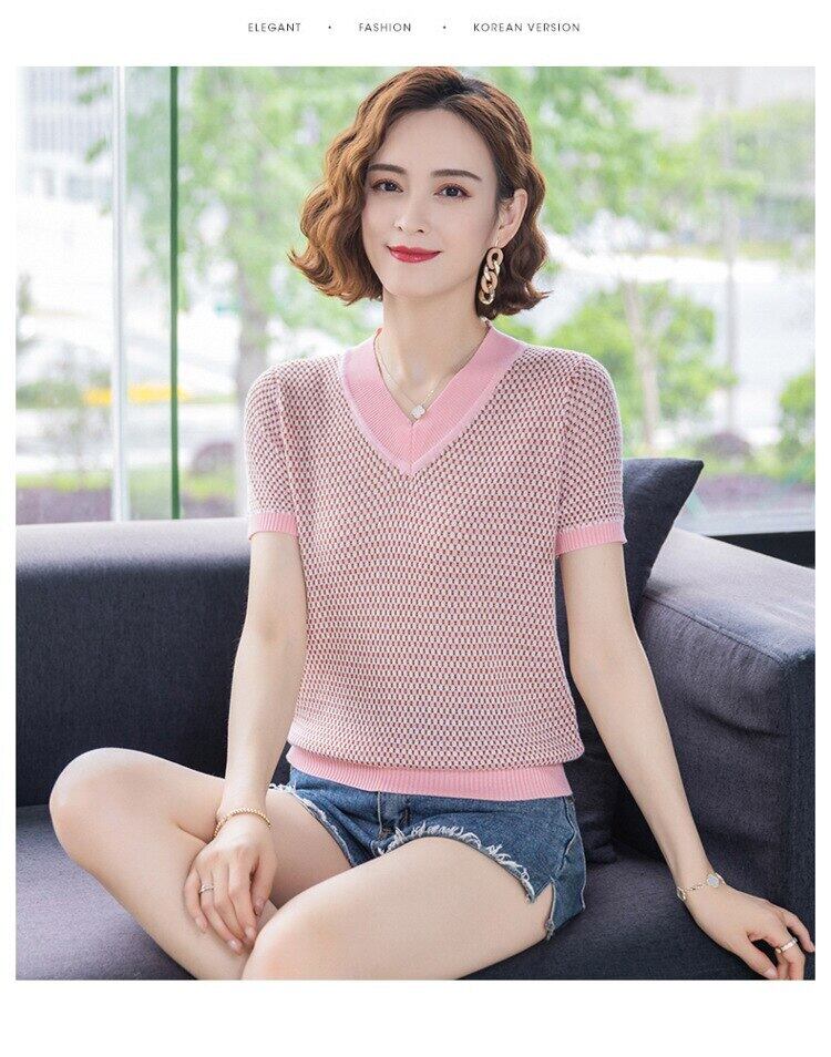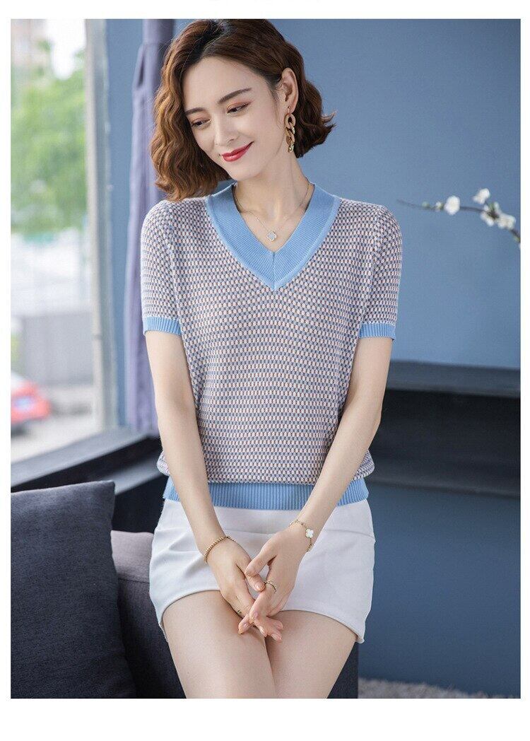 アイスシルク Tシャツ女性薄型夏 2022 V ネックチェック柄ニットトップス半袖 Tシャツレディース Camisetas ショート ハーフスリーブ サマー 夏物 Vネック Son68151016445