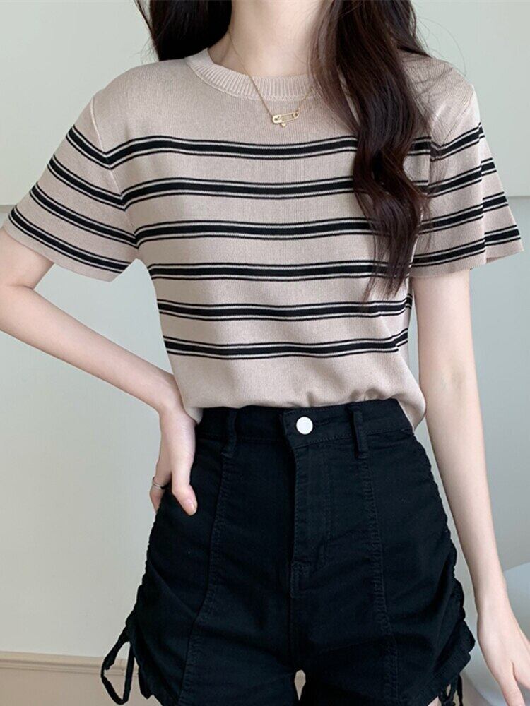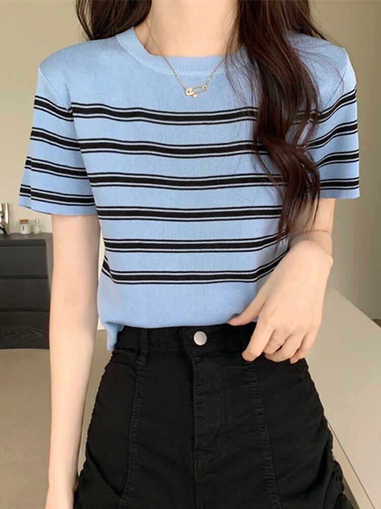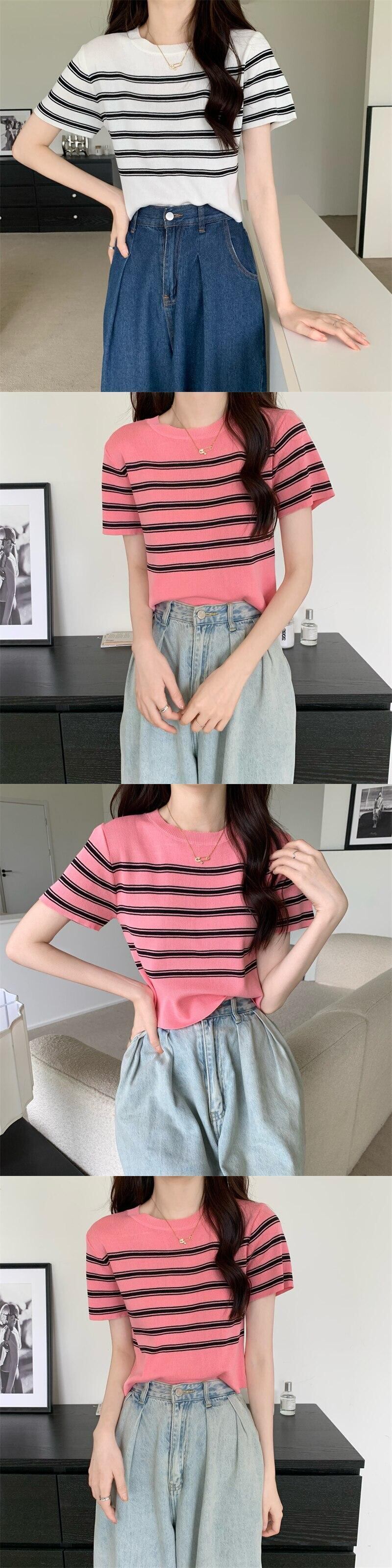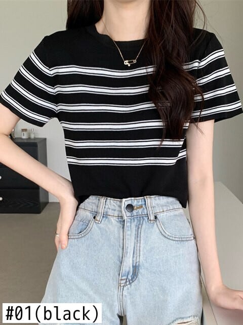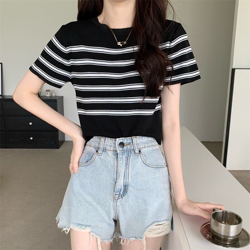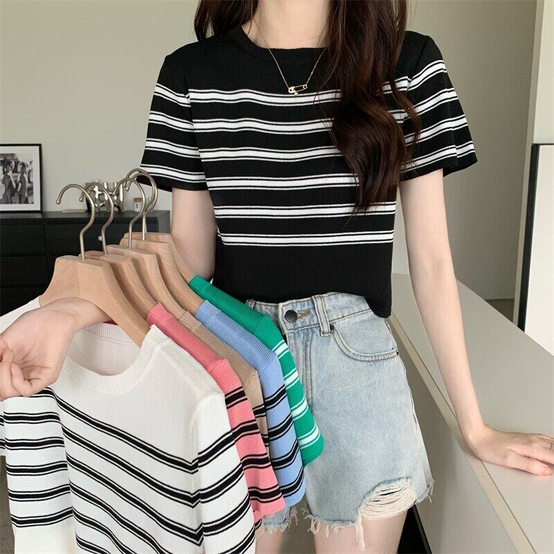 クロップトップ女性ストライプ Tシャツ服ニット半袖 Tシャツ 2022 夏黒スリムベーシック Tシャツ ショート ブラック ハーフスリーブ サマー 夏物 Son58820132282