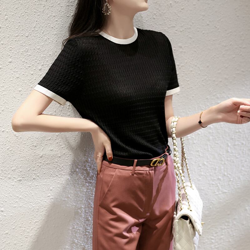 ニット中空アウトホワイト Tシャツ女性コントラストカラートップ半袖 Tシャツ 2022 夏薄い女性トップス mujer ショート ハーフスリーブ サマー 夏物 Son16392784044