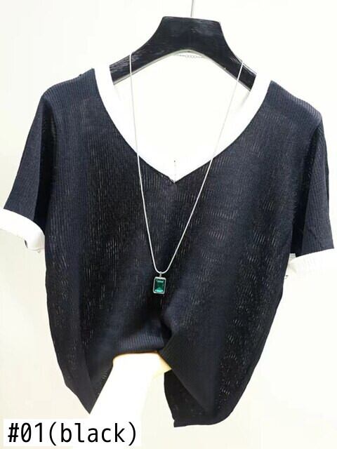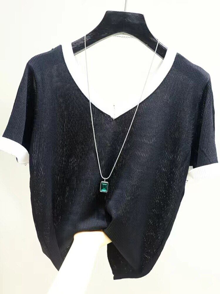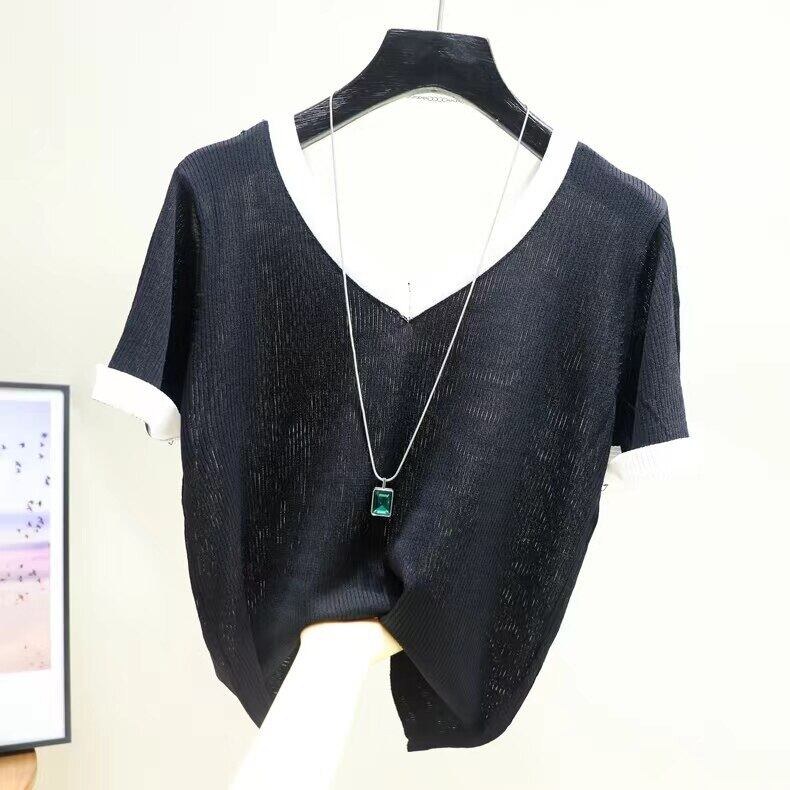 ニットトップ女性 Tシャツコントラストカラー半袖 Tシャツ V ネック婦人服 Tシャツ 2022 夏 ショート ハーフスリーブ サマー 夏物 Vネック Son73014576825