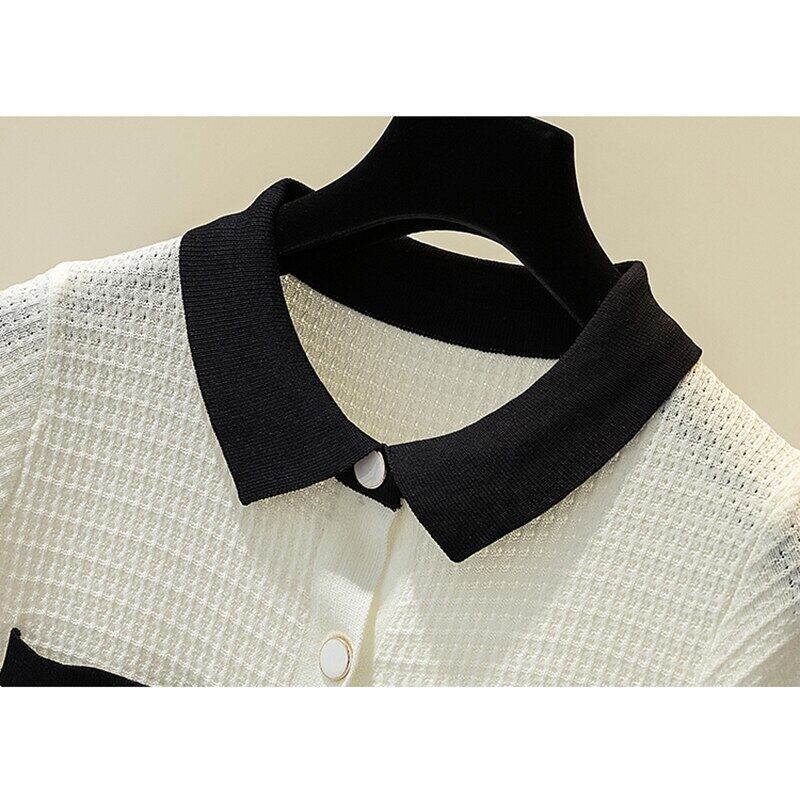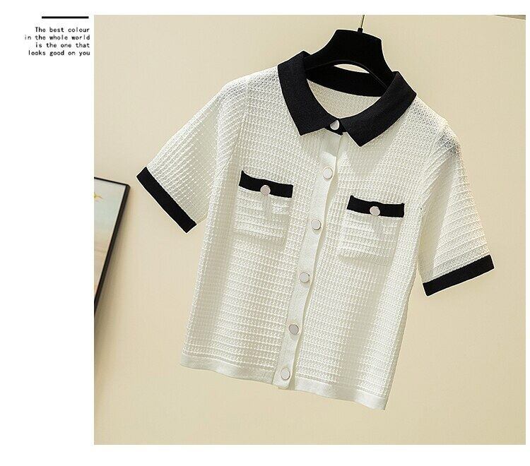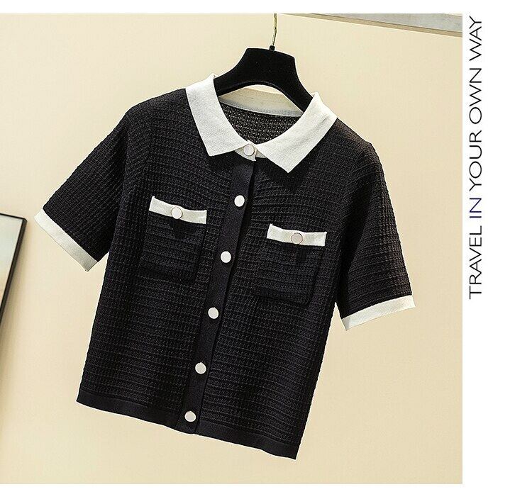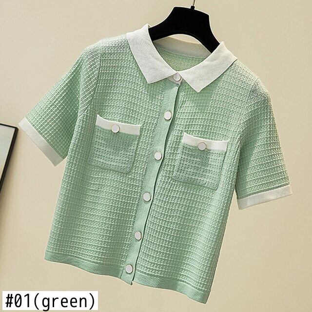 LJSXLS シングルブレスト半袖カーディガンニットセーター女性 2021 夏コントラストカラーセーター ショート ハーフスリーブ サマー 夏物 Son37921915121