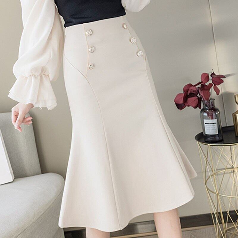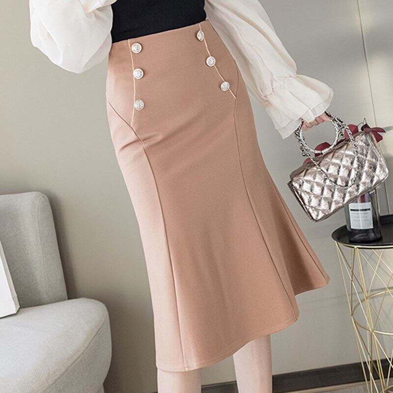 LJSXLS 2022 秋ペチコートボタンウエストソリッドマーメイドスカート女性オフィスレディジッパースカート オータム 秋物 ソリッドカラー 会社 学校 通勤や通学にも Son98749493447