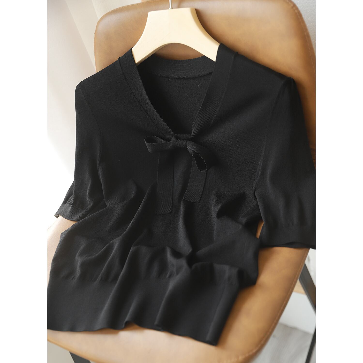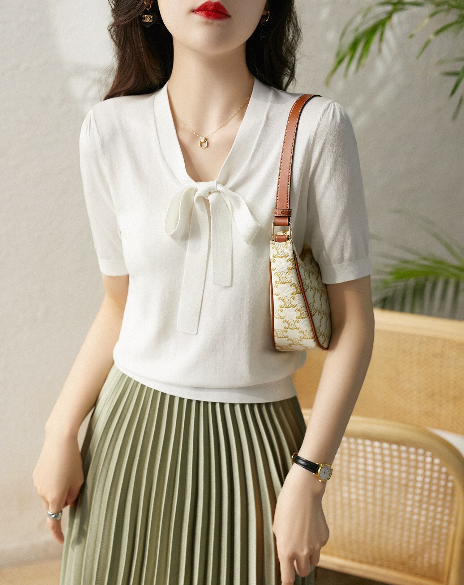 白弓 Tシャツ女性 2022 薄型ニットトップス半袖 Tシャツ夏の婦人服 ショート ホワイト リボン ハーフスリーブ サマー 夏物 Son2961766201
