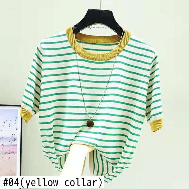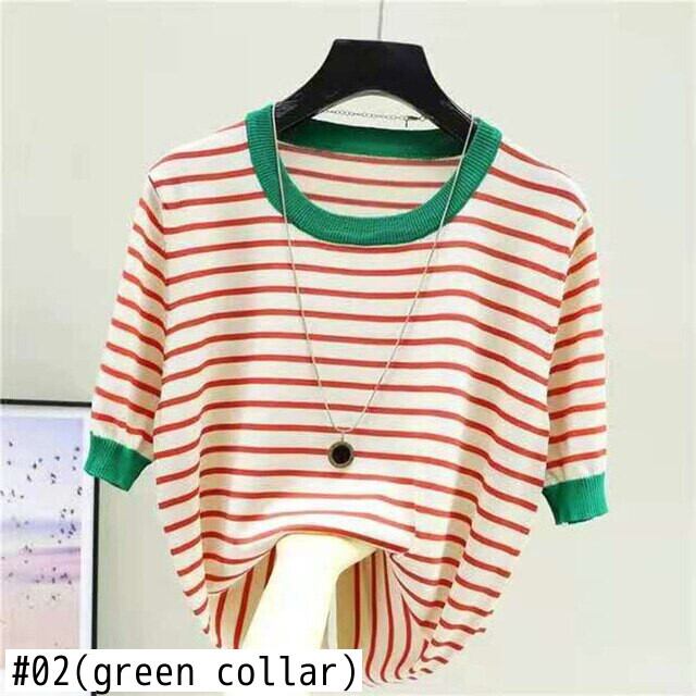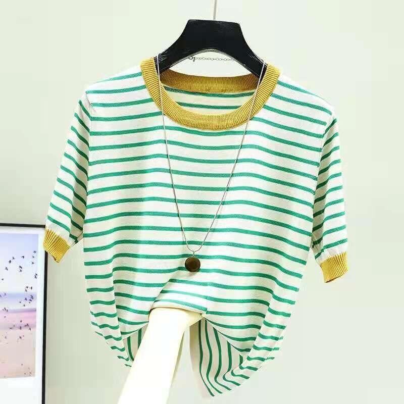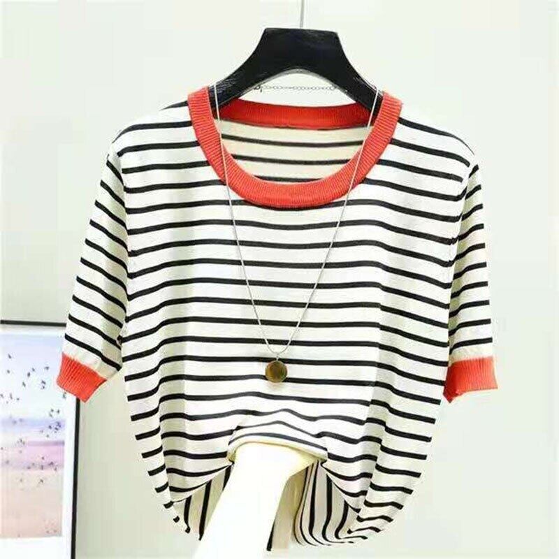 ストライプトップス O ネック Tシャツ女性薄型ニット半袖 Tシャツ Camisetas 2022 夏 Tシャツ ショート ハーフスリーブ サマー 夏物 Oネック Son16487454774