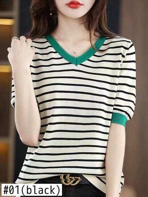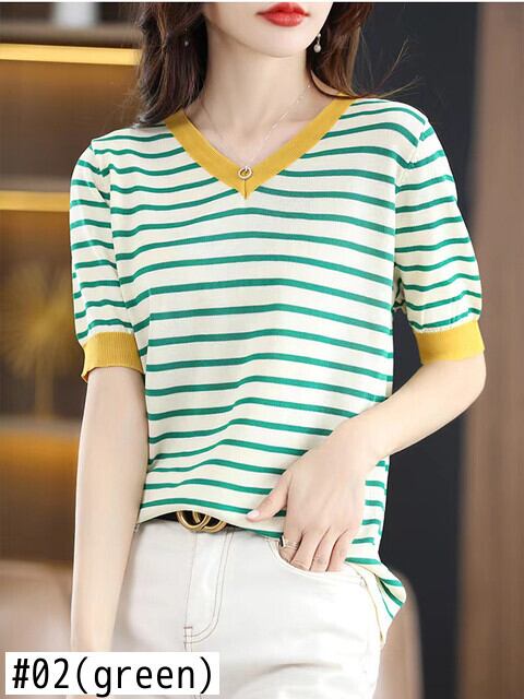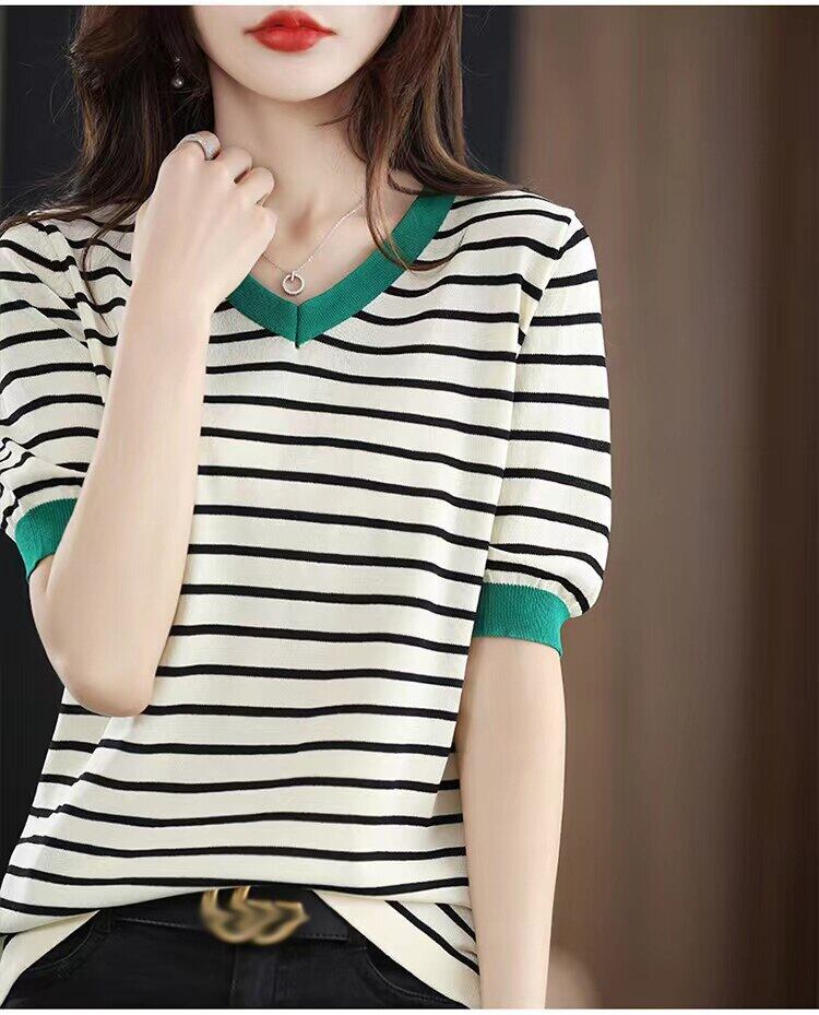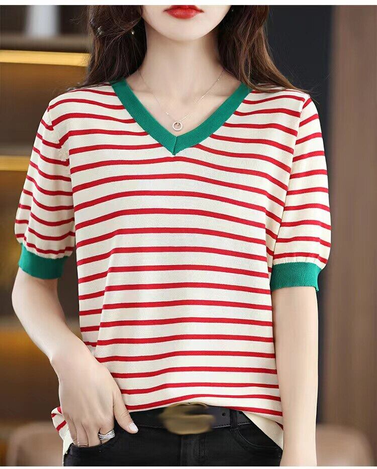 女性の夏の V ネック Tシャツストライプ Tシャツ 2022 半袖トップベーシック Tシャツニット服 Camisetas デ ショート ハーフスリーブ サマー 夏物 Vネック Son40399034409