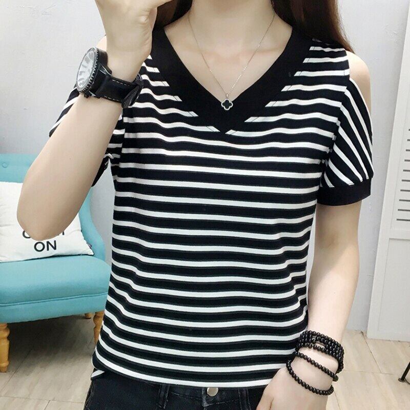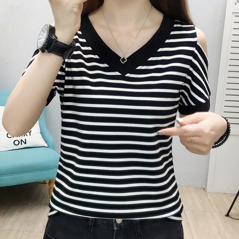LJSXLS 夏ストライプコットン Tシャツ女性オフショルダートップ V ネック半袖 Tシャツ 2022 レディース ショート ハーフスリーブ サマー 夏物 Vネック Son37171231944