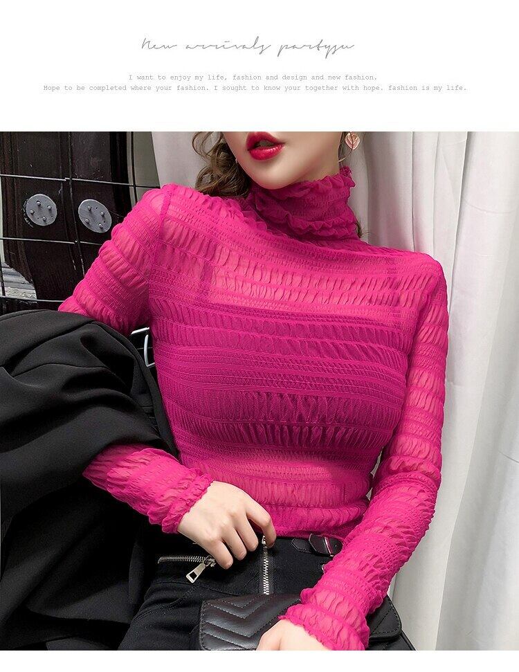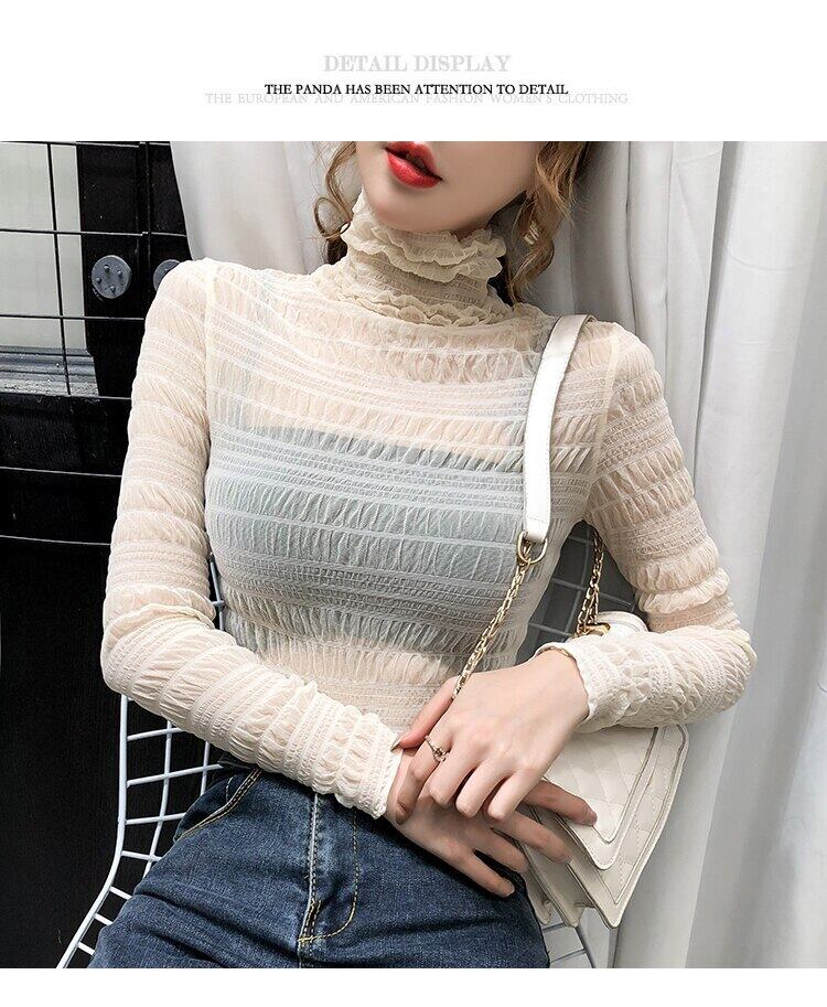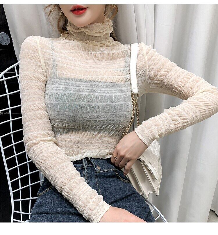LJSXLS 2022 秋メッシュブラウス女性薄いセクシーなスリムシャツ長袖トップス婦人服 ロング Son87815571887