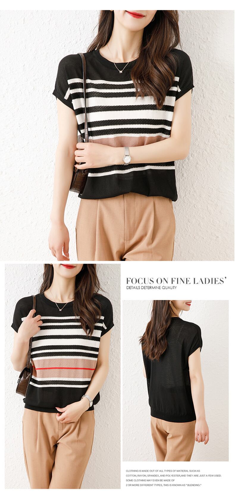 Tシャツ女性ストライプ Tシャツ 2022 夏ニットトップス女性服半袖 Tシャツ O ネック Tシャツ ショート ハーフスリーブ サマー 夏物 Oネック Son46840711617