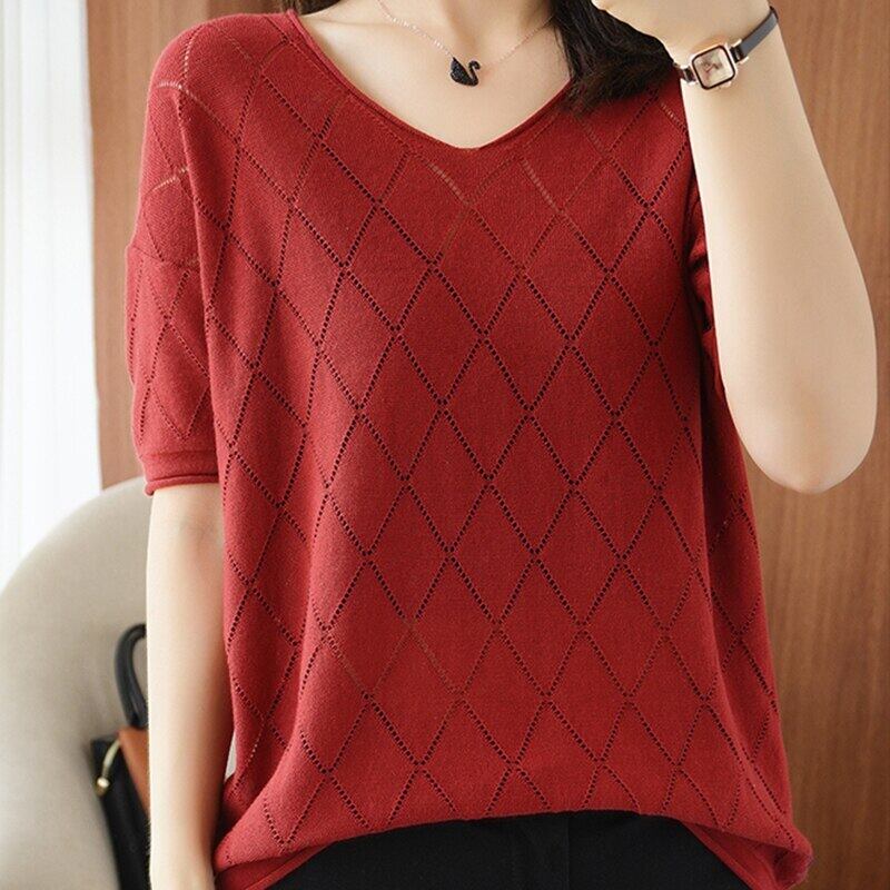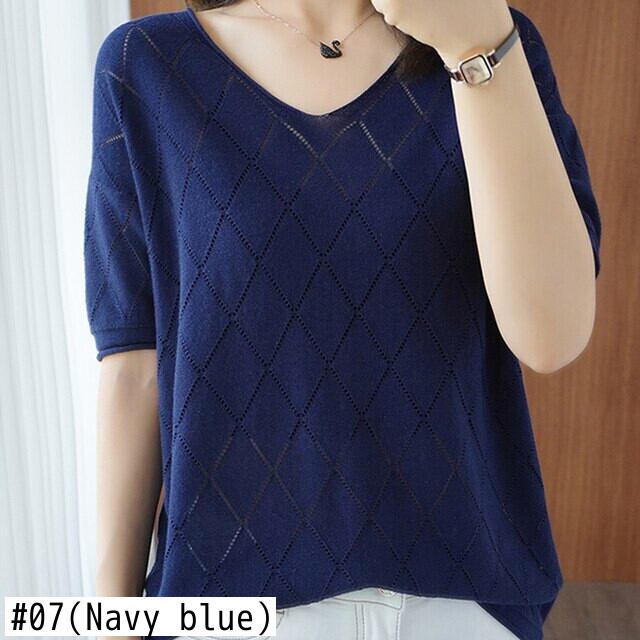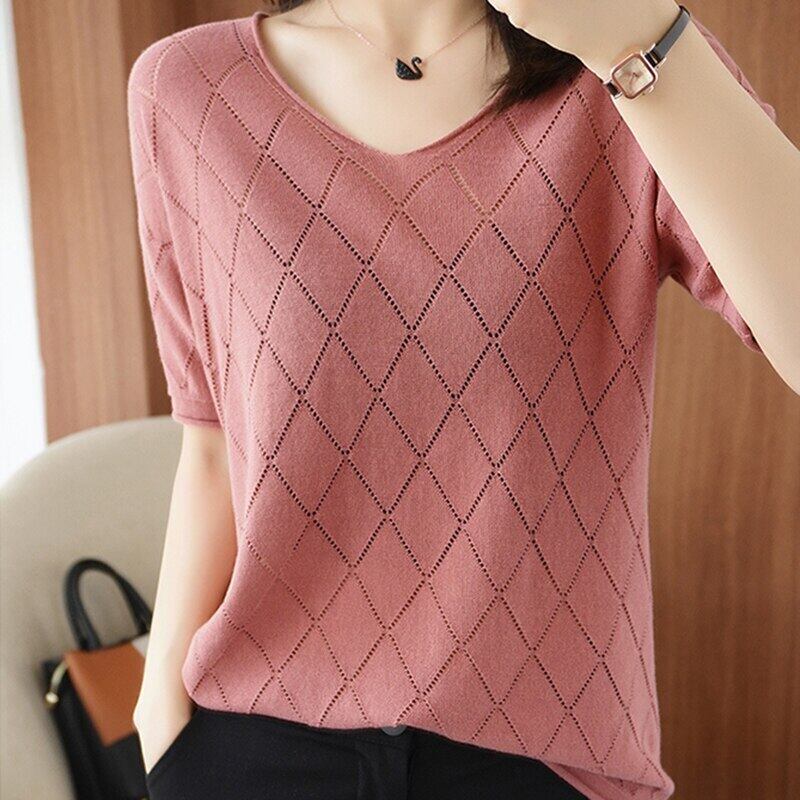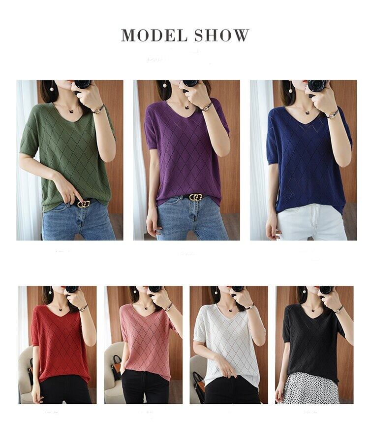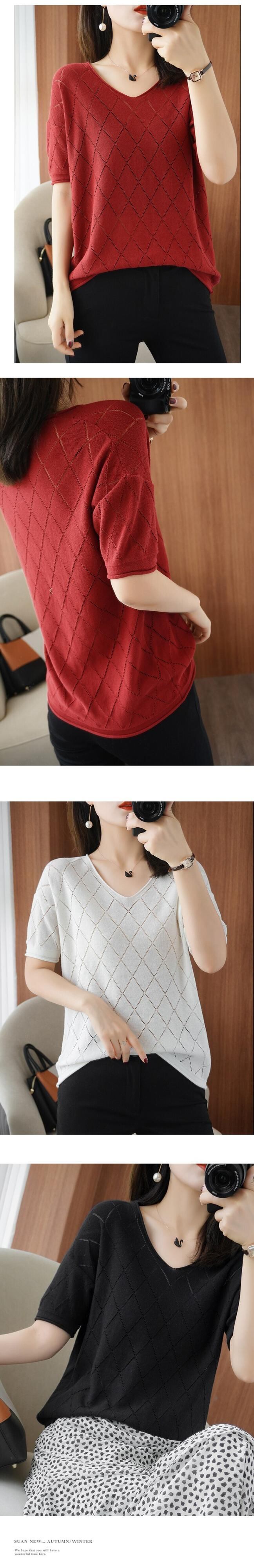 LJSXLS V ネック Tシャツ女性半袖 Tシャツ薄いニット服 2021 夏中空アウトトップス Tシャツ ショート ハーフスリーブ サマー 夏物 Vネック Son91855504461
