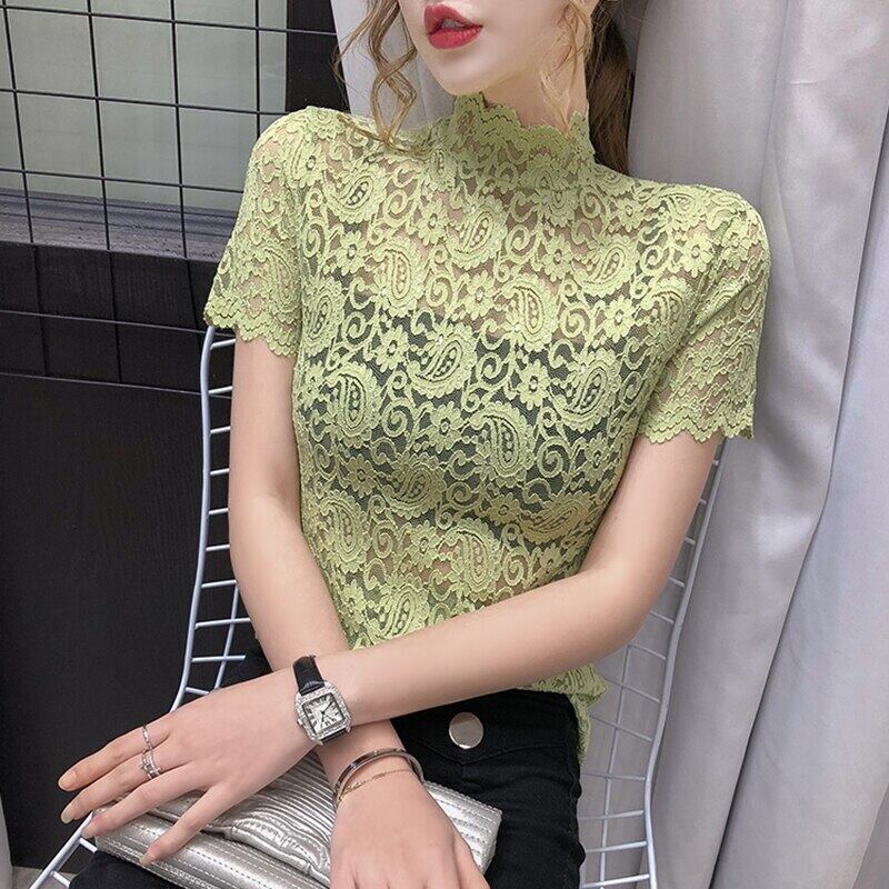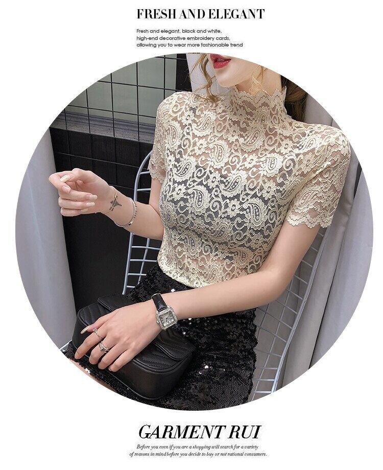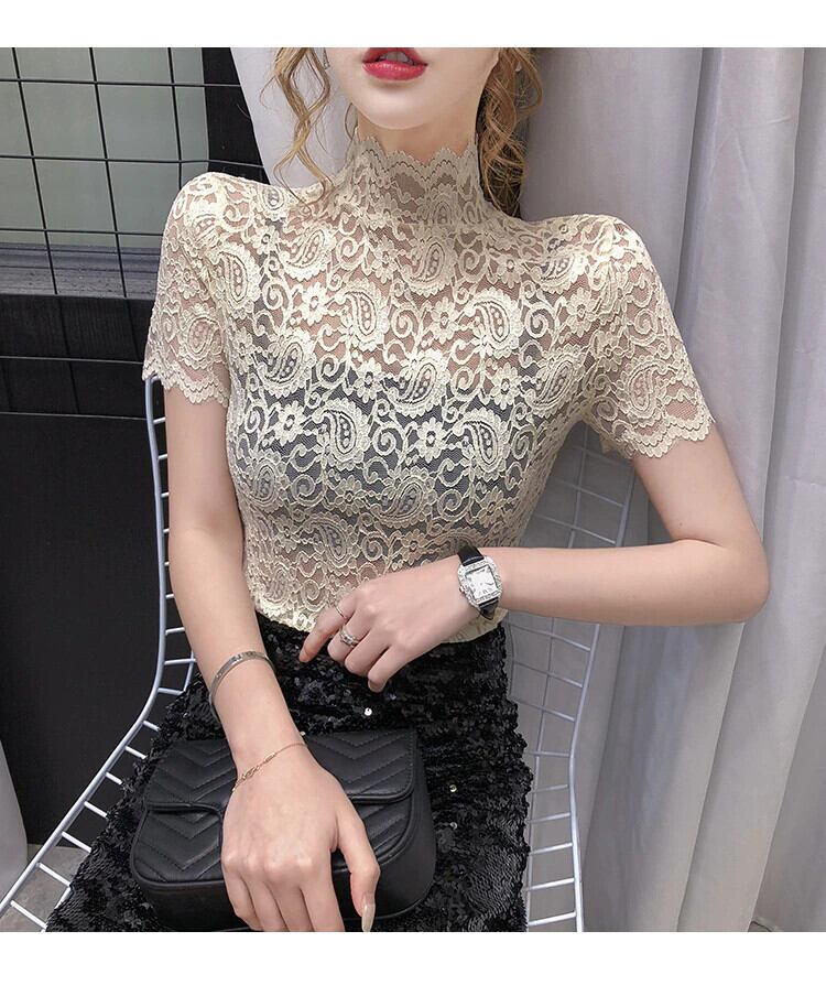 LJSXLS 2022 夏中空アウトハーフタートルネックレースブラウス女性のセクシーなスリム薄型シャツスタイルトップス サマー 夏物 Son70407697278