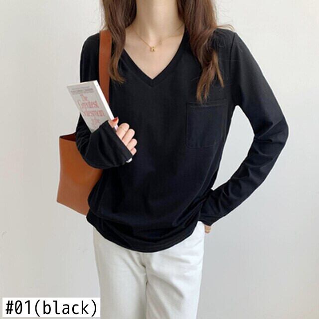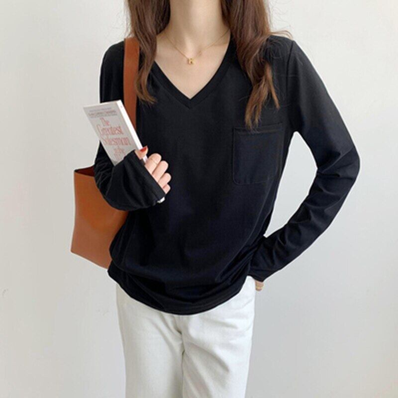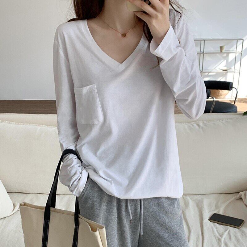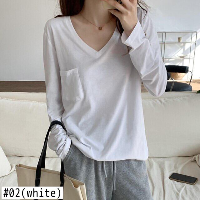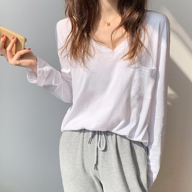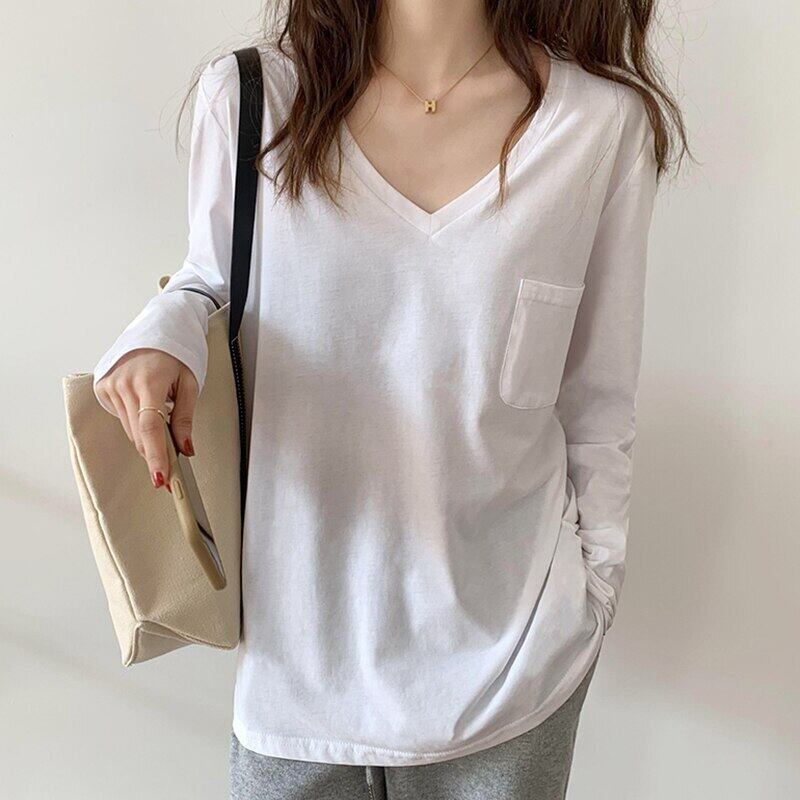 ホワイトコットンレディースTシャツソリッドVネックポケットTシャツレディースルーズロングスリーブトップ秋スタイル 長袖 オータム 秋物 ソリッドカラー Son32272183607