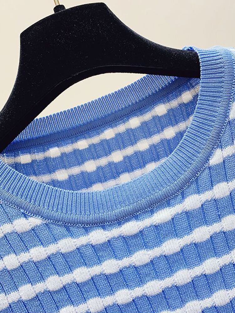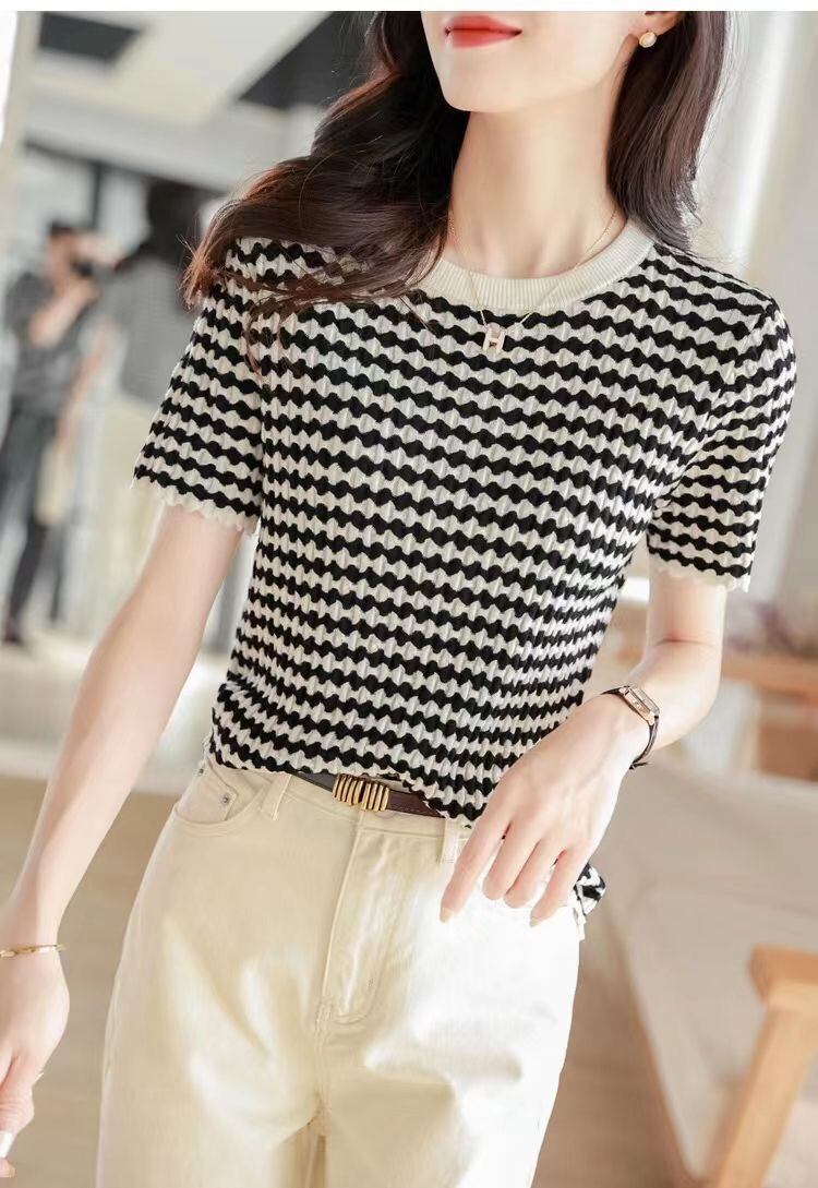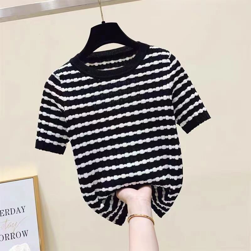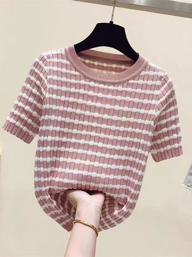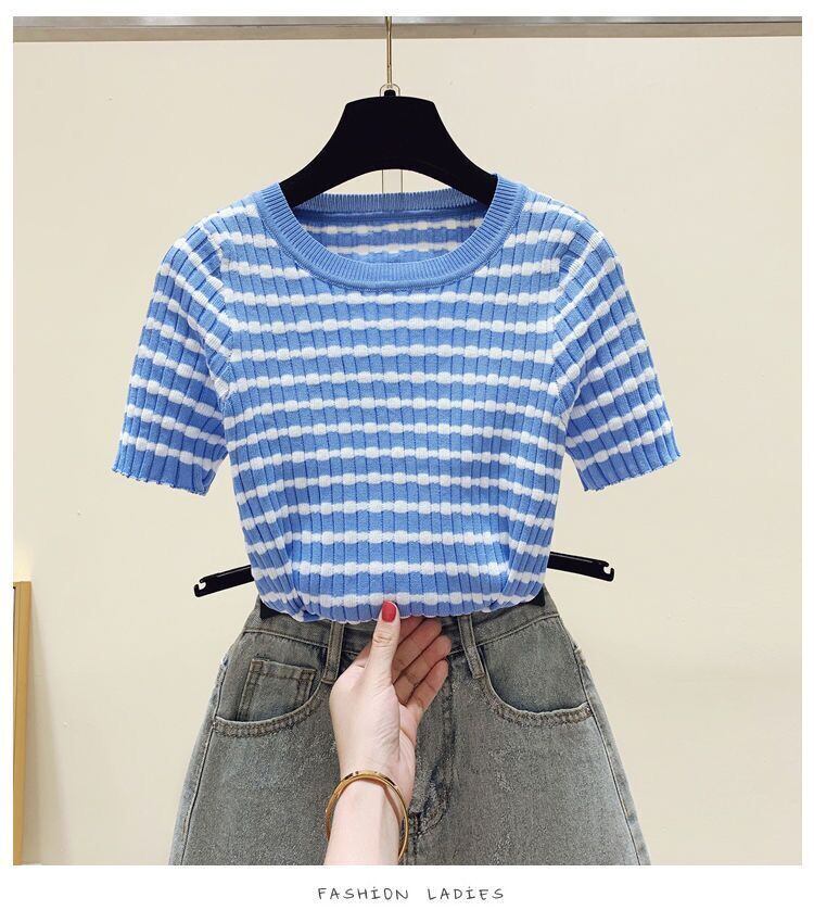 LJSXLS レディース 2022 夏ストライプニット Tシャツ女性 Tシャツスリムトップス半袖 Tシャツ ショート ハーフスリーブ サマー 夏物 Son24350213409