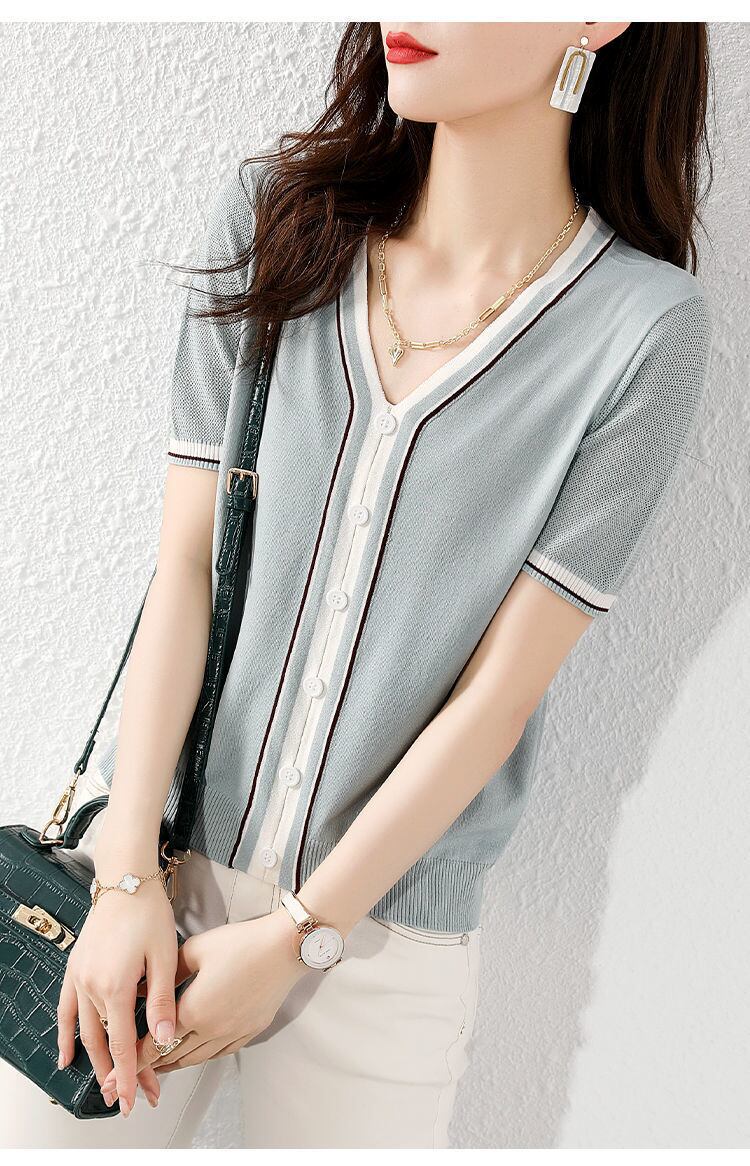 V ネック Tシャツ女性ボタンアップ Tシャツコントラストカラートップ女性服夏 2022 ニットトップス半袖 Tシャツ ショート ハーフスリーブ サマー 夏物 Son16035908513