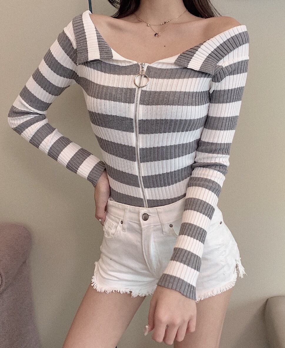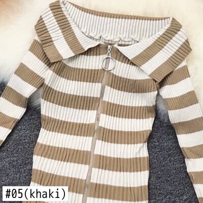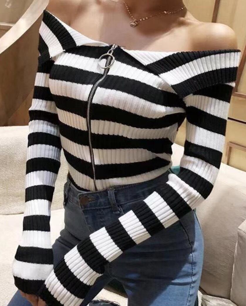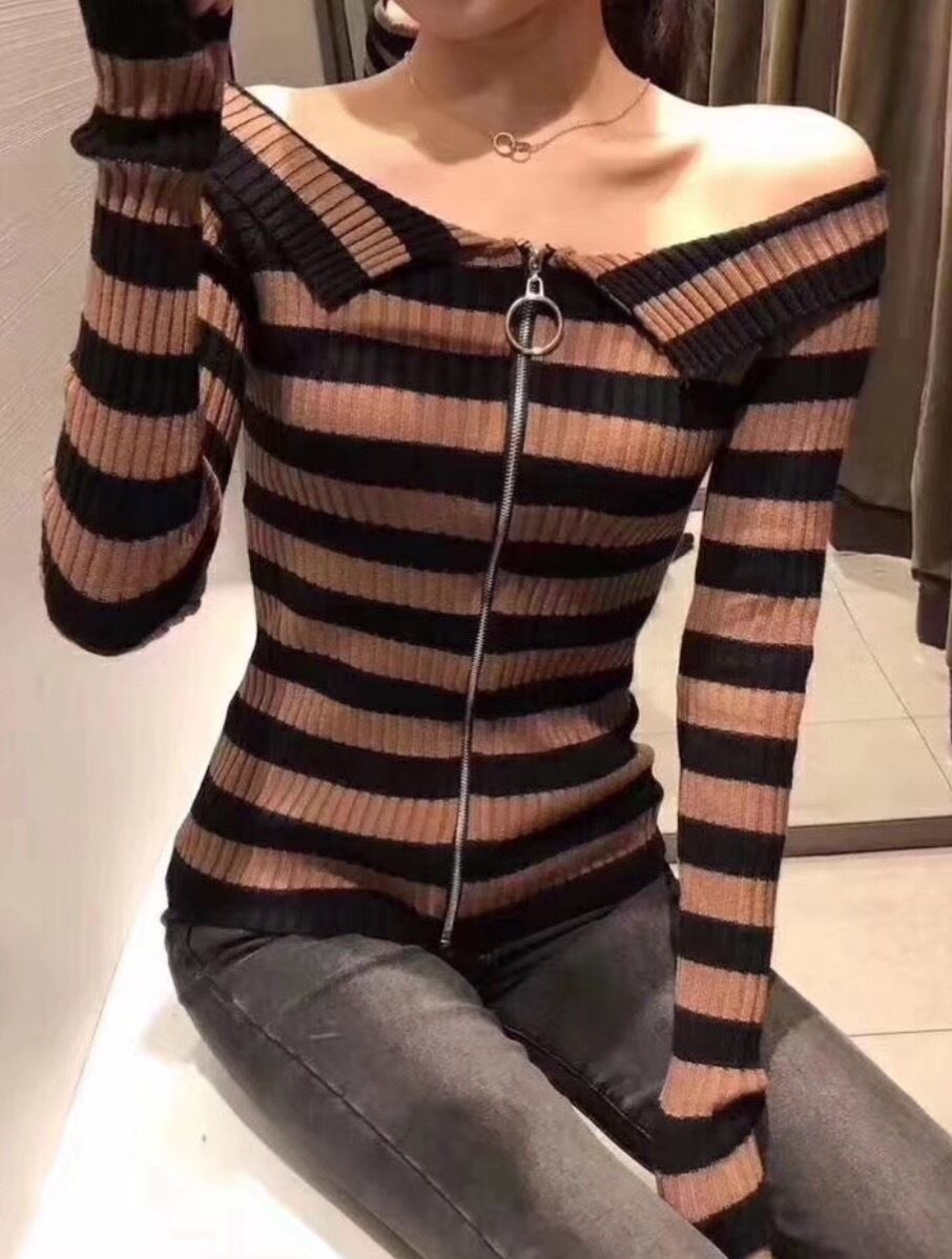 セクシーなジッパーオフショルダーセーター女性ストライプ 2022 春秋のニットセーターカーディガン長袖トップ ロング スプリング 春物 オータム 秋物 Son98998087880