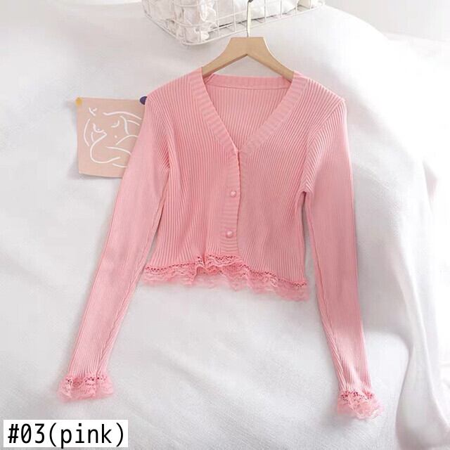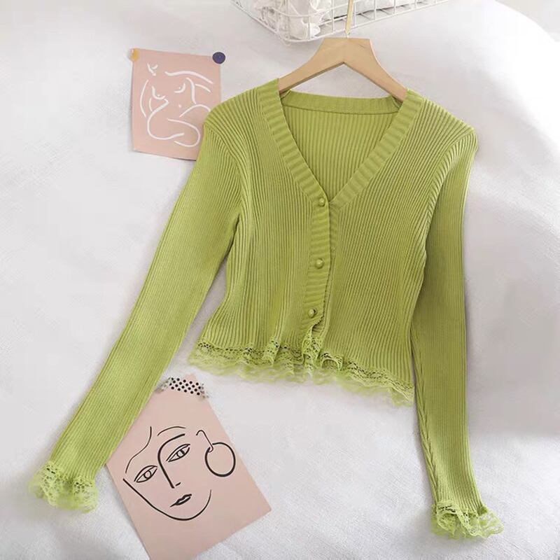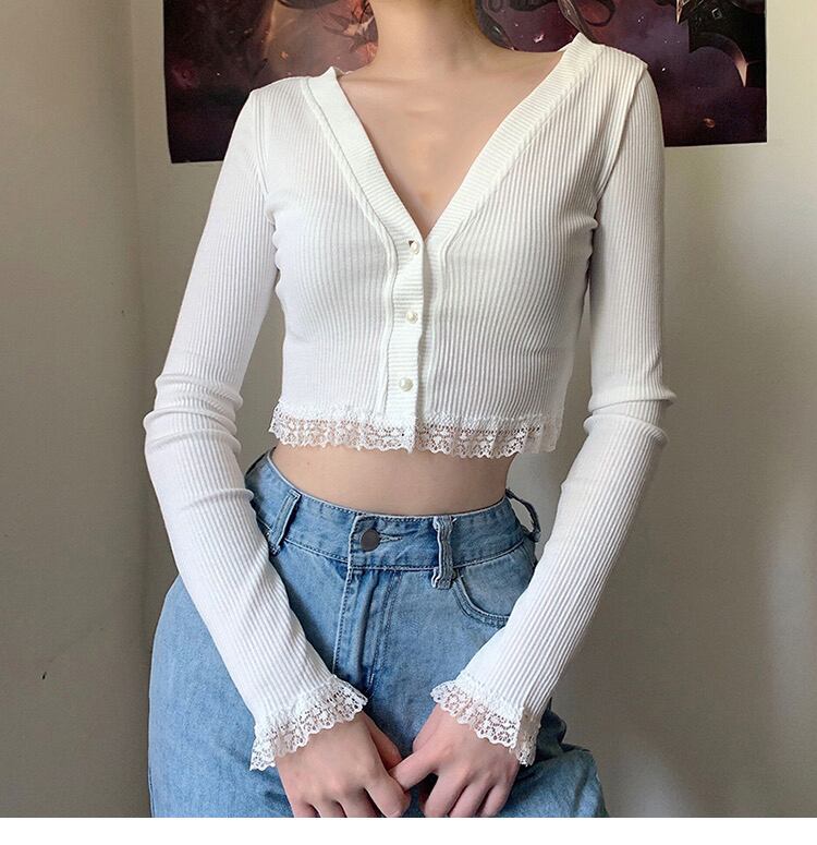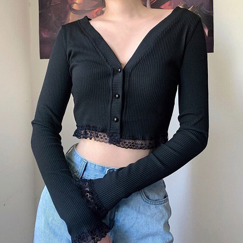 ニットカーディガンセーター女性秋長袖 V ネックの女性服レースパッチワークセクシーなスリム黒薄型クロップトップスプル ロング ブラック オータム 秋物 Vネック Son85356582232