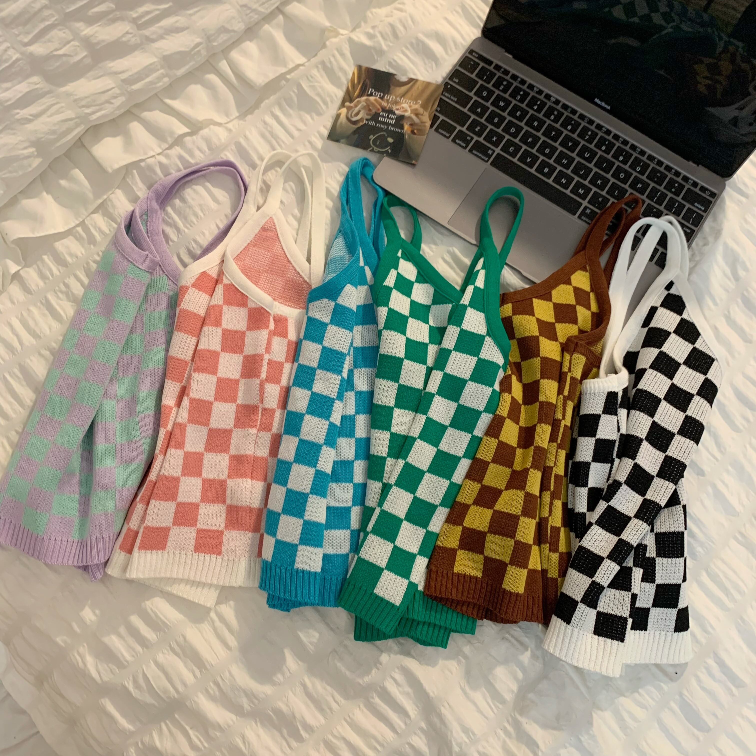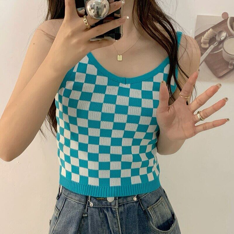2022 セクシーなニット格子縞のタンクトップ女性ノースリーブクロップトップ夏の女性の V ネックキャミソールベストタンクキャミソール サマー 夏物 Vネック Son39404730265