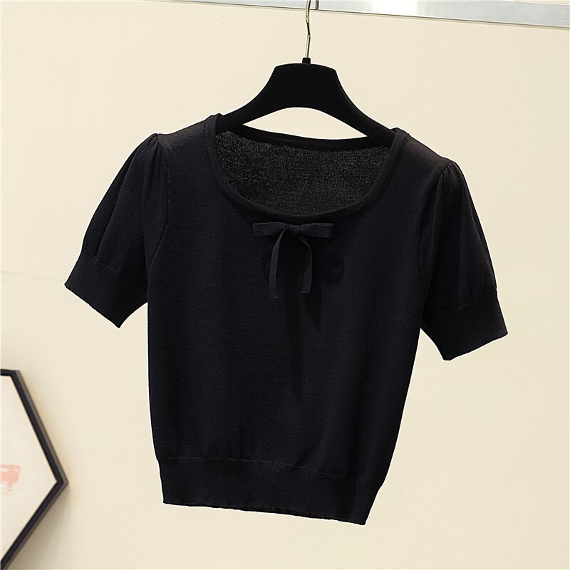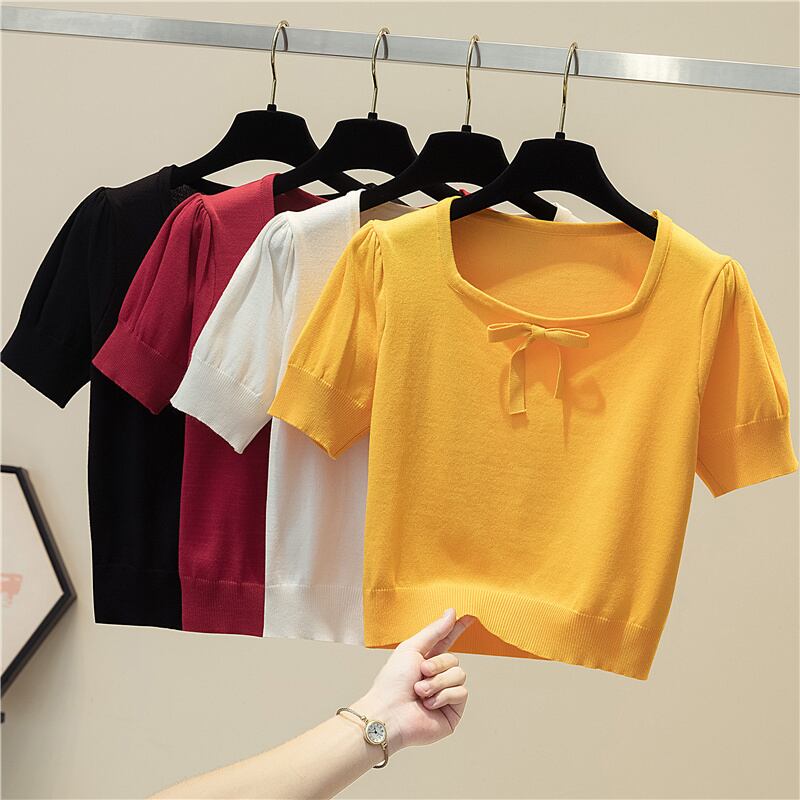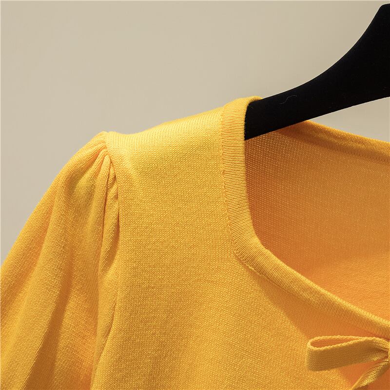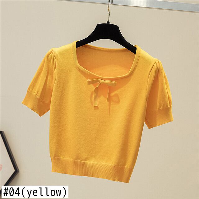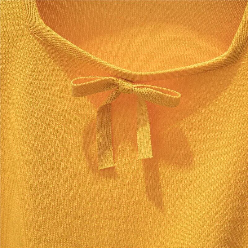 LJSXLS 2022 半袖 Tシャツ女性ニット弓 Tシャツソリッドトップス夏スクエアカラー黄色 Tシャツ ショート リボン ハーフスリーブ サマー 夏物 ソリッドカラー スクウェア Son57136946510