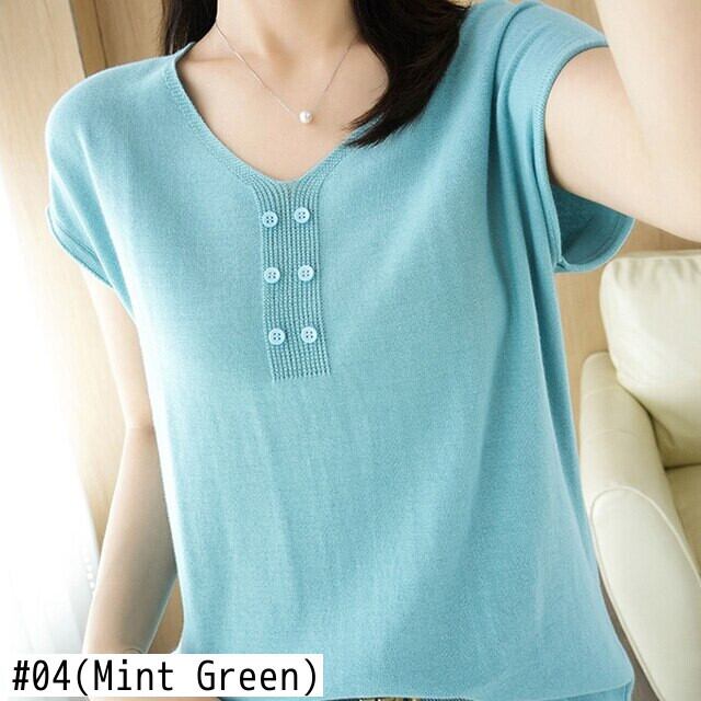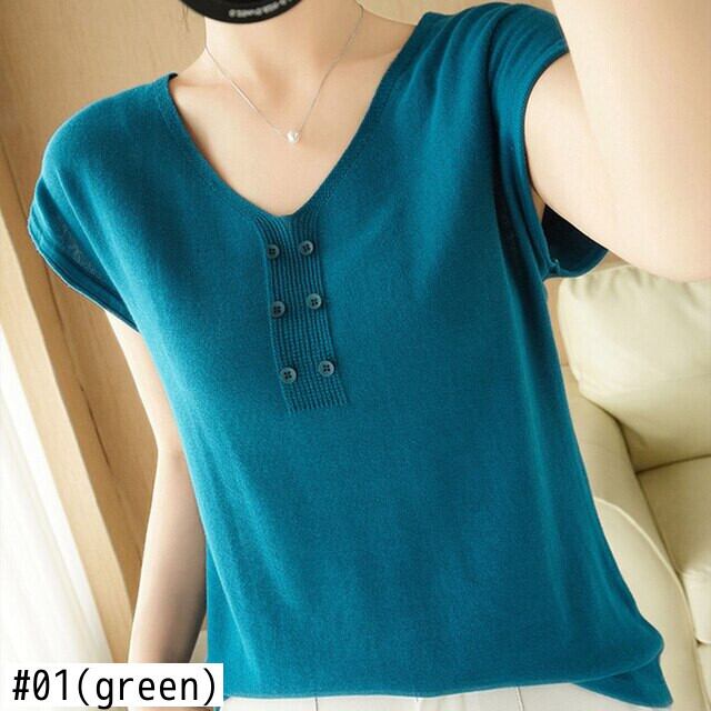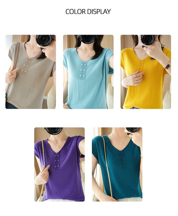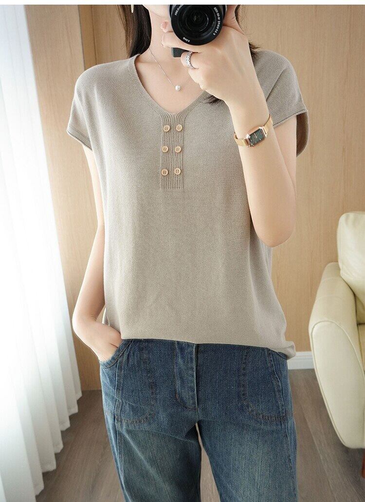 LJS XLS V ネックニット半袖 Tシャツ女性服トップ 2022 夏ボタン Tシャツ Camisetas デ ショート ハーフスリーブ サマー 夏物 Vネック Son14882958378