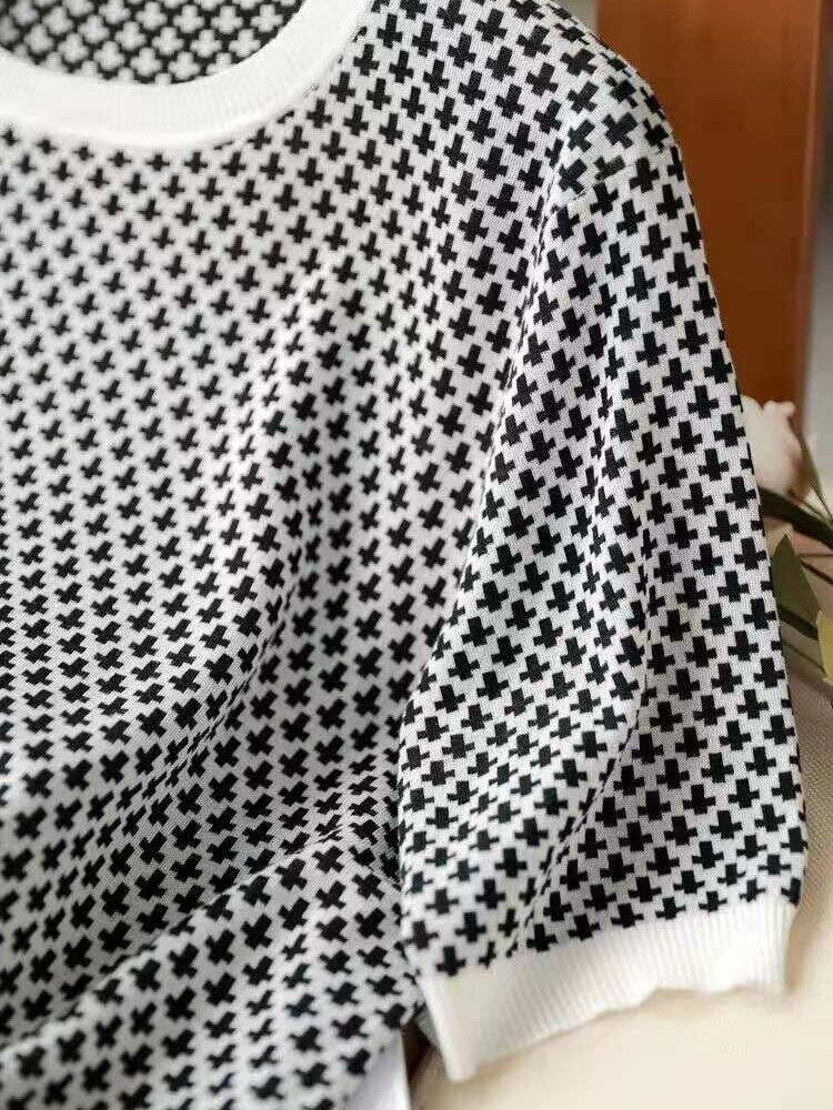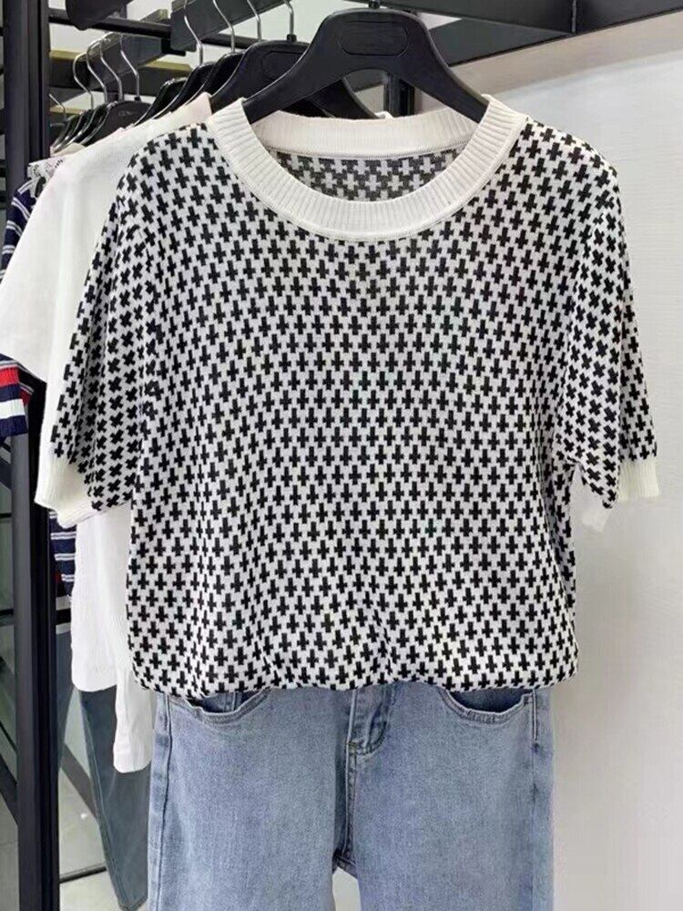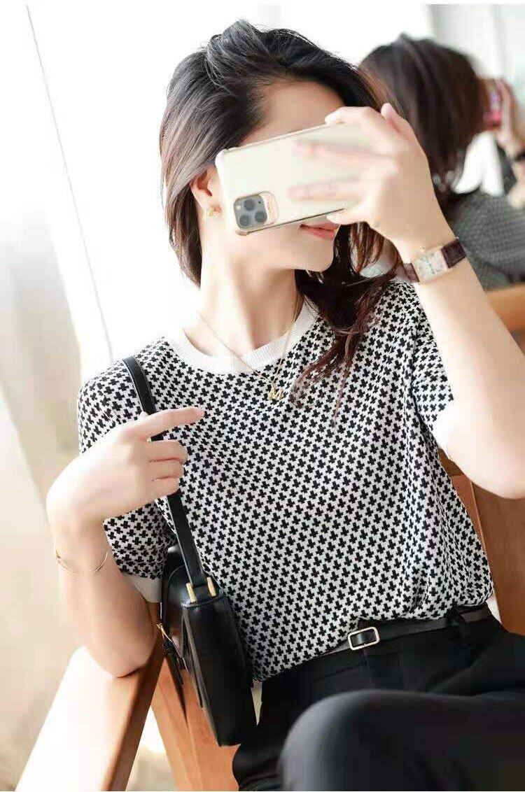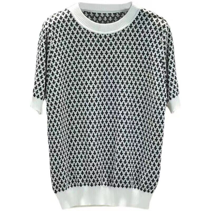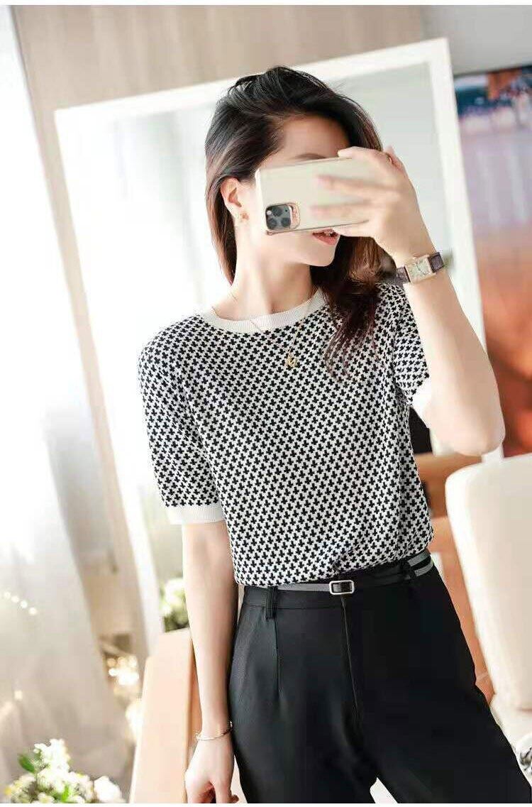 薄い格子縞の基本的なニットセーターの女性 2022 夏 O ネック半袖プルオーバートップスレディースプル ショート ハーフスリーブ サマー 夏物 Oネック Son88426897691