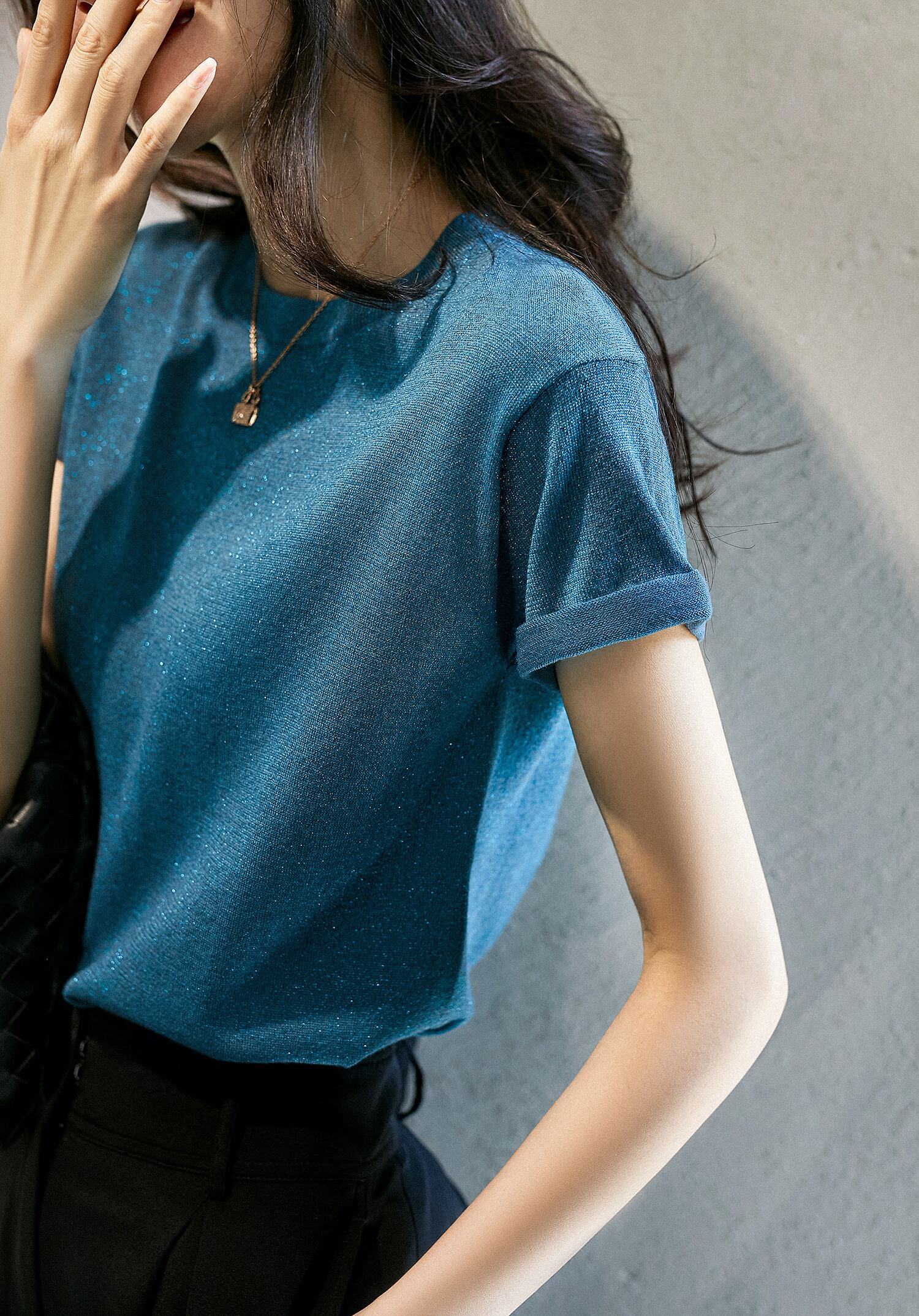 ニット Tシャツ明るいシルク夏トップス 2022 女性服半袖 Tシャツ弾性 Tシャツブルー Camisetas デ ショート ハーフスリーブ エラスティック 伸縮 サマー 夏物 Son77986068469
