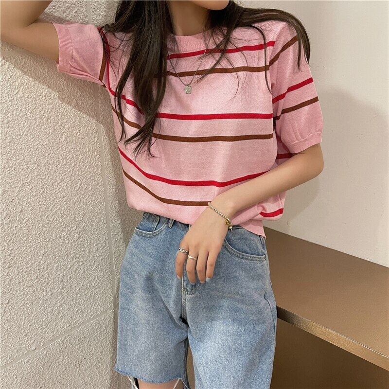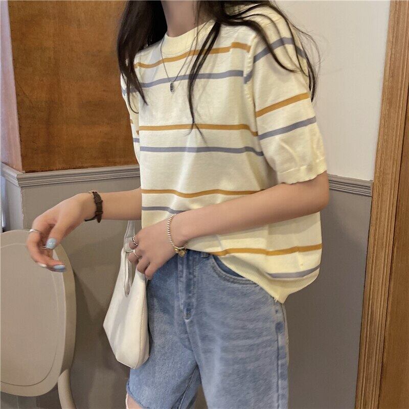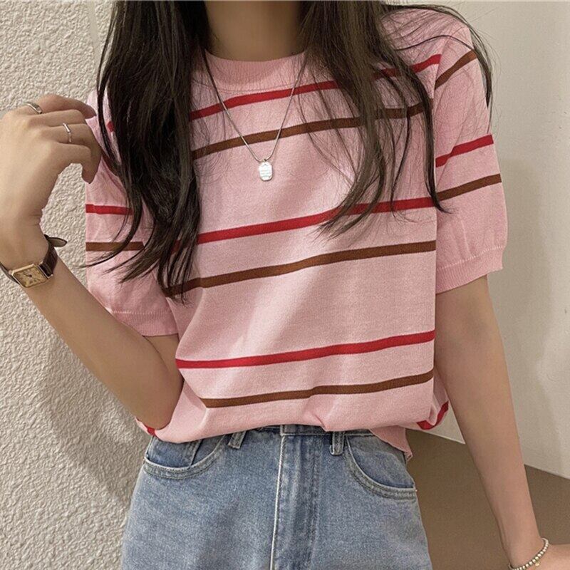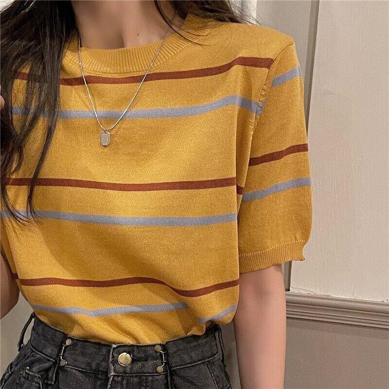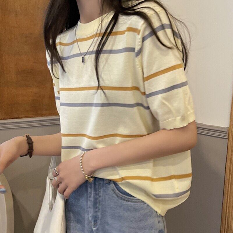ストライプニット Tシャツ半袖 Tシャツ夏の女性服トップ O ネック全試合弾性 Ladis Tシャツ ショート ハーフスリーブ エラスティック 伸縮 サマー 夏物 Oネック Son86479840387