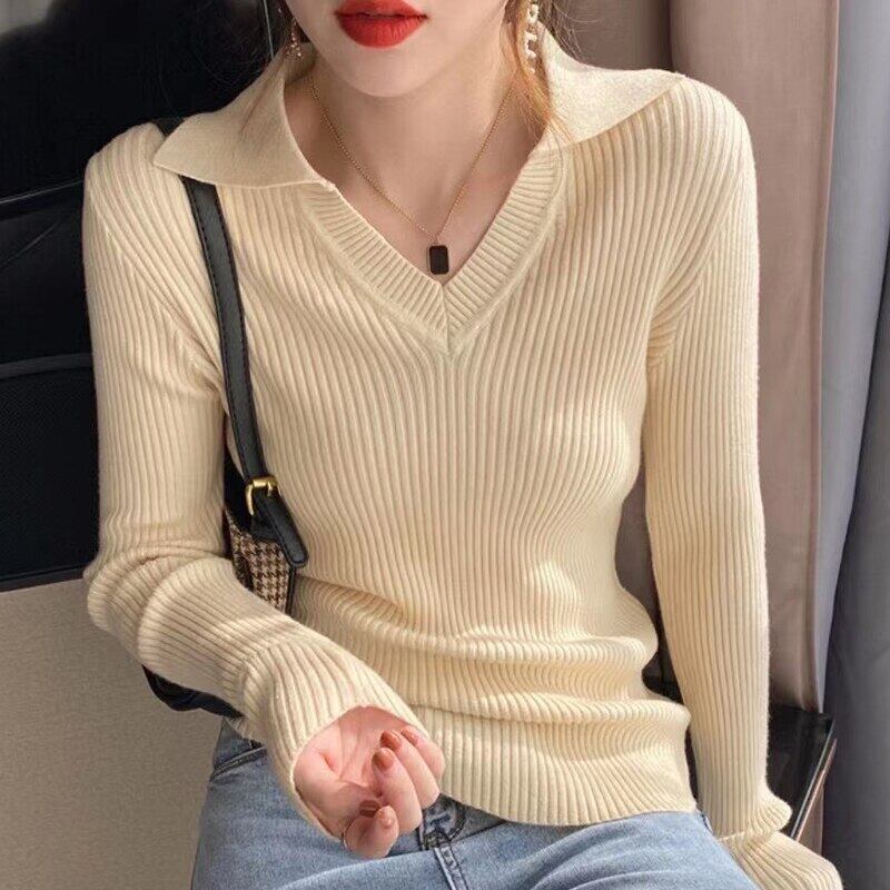 スタイルターンダウン襟ニットセータープルオーバー女性 2021 秋冬長袖スリムソフトソリッドセータートップス ロング オータム 秋物 ウィンター 冬物 ソリッドカラー Son31377515614