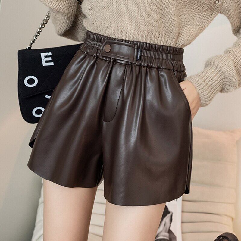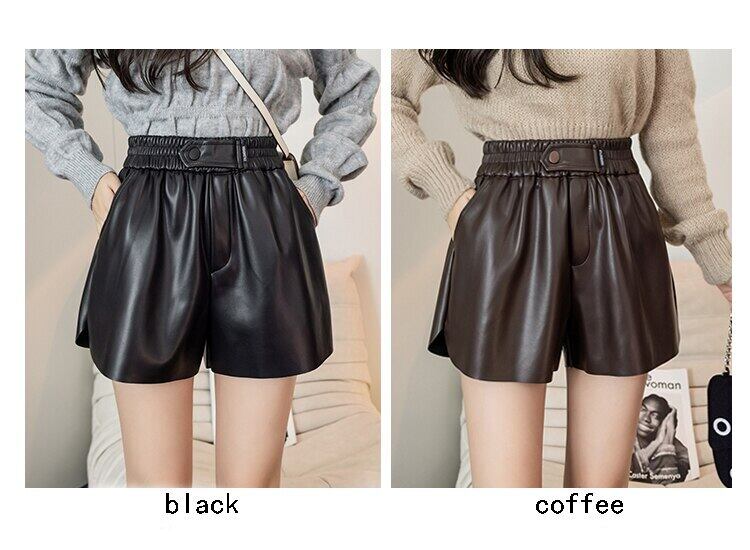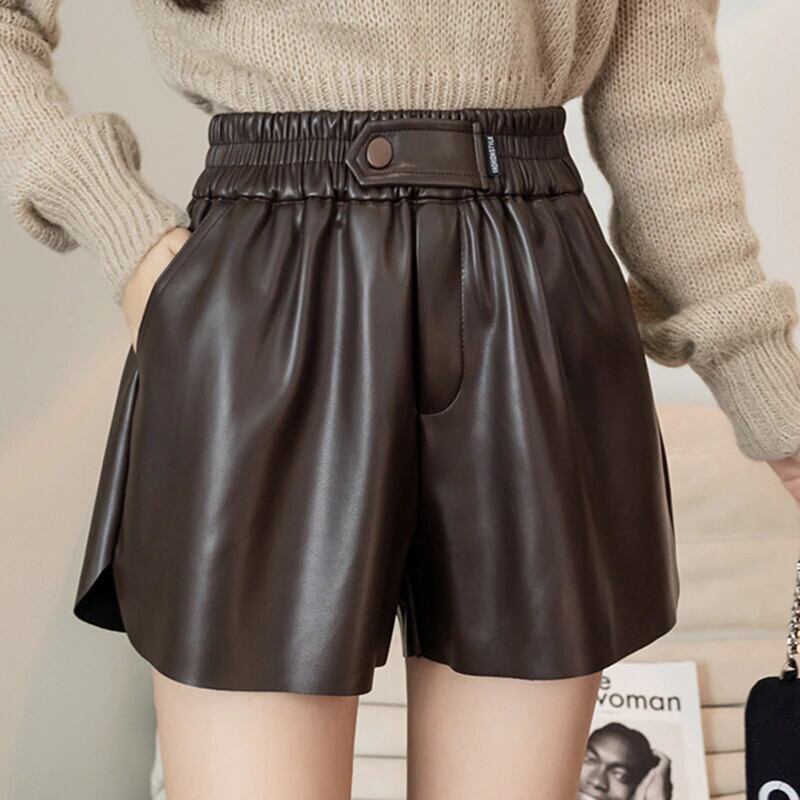 LJSXLS ワイド脚 Pu レザー黒ショーツ女性 2021 秋冬弾性ウエストルーズショーツ ブラック エラスティック 伸縮 オータム 秋物 ウィンター 冬物 ブルマー ワイドレッグ ワイドパンツ Son39196943999