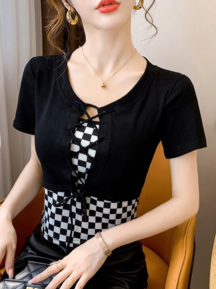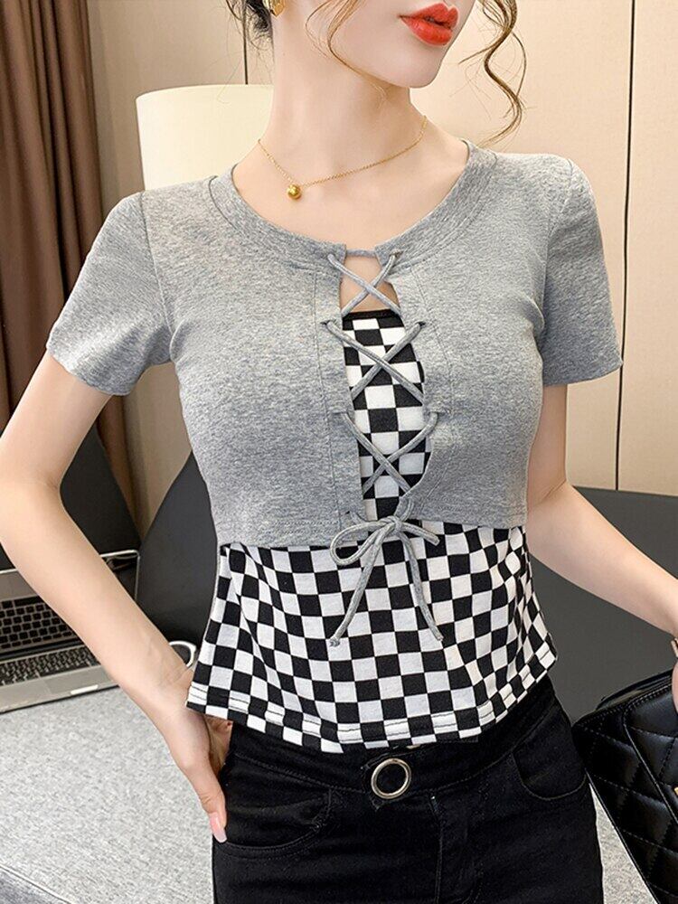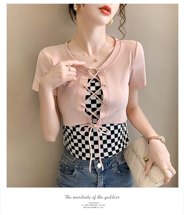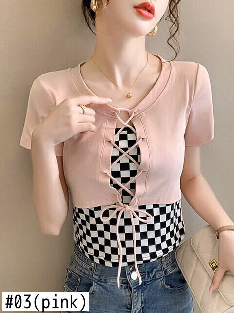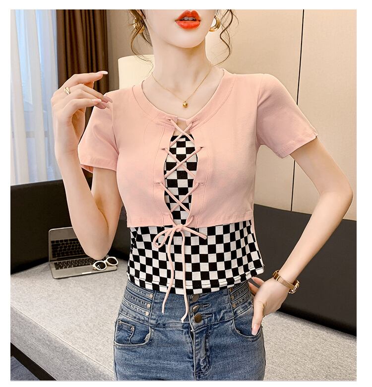 チェック柄 Tシャツ女性フェイクツーピーストップ 2022 綿 O ネック半袖 Tシャツクロップトップス夏の女性の服 ショート コットン ハーフスリーブ サマー 夏物 Oネック Son53742662128