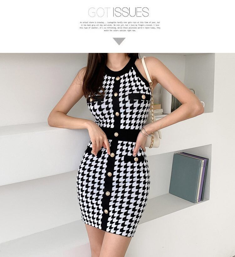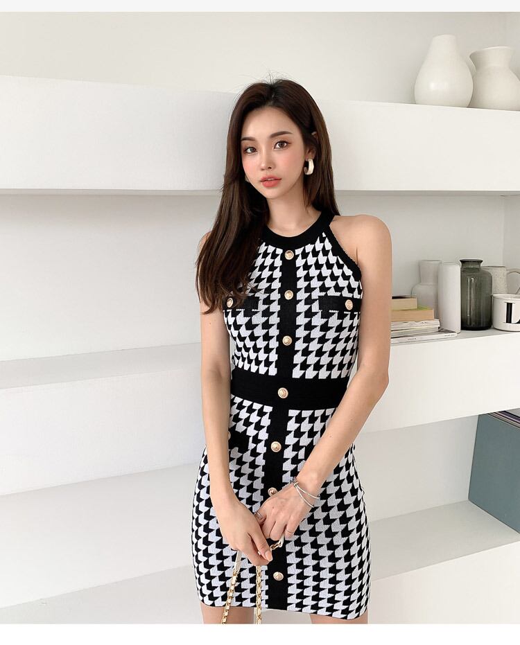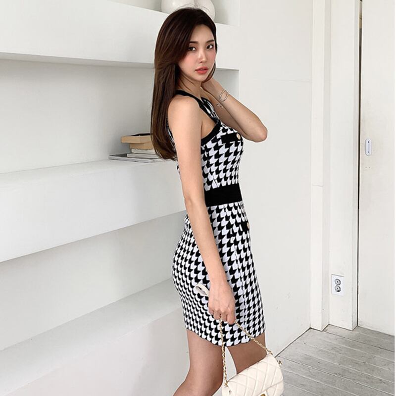 ローブ Ete 2022 ニットボタン格子縞のドレスの女性の夏のオフショルダーのセクシーなボディコンドレス婦人服 サマー 夏物 Son3597919833