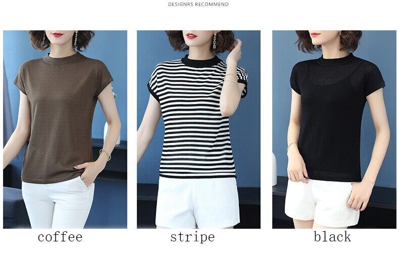 LJSXLS ベーシック O ネックニット女性セーター夏スリム半袖ストライプセータープルオーバー 2021 レディース服 ショート ハーフスリーブ サマー 夏物 Oネック Son12592586295