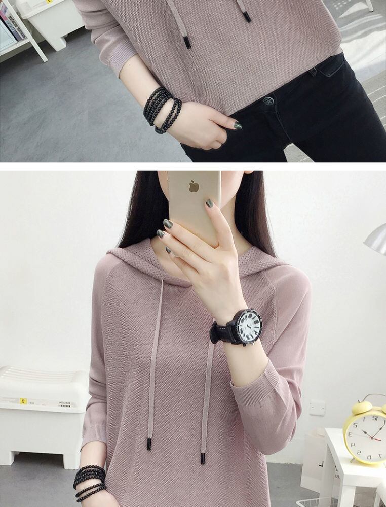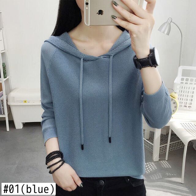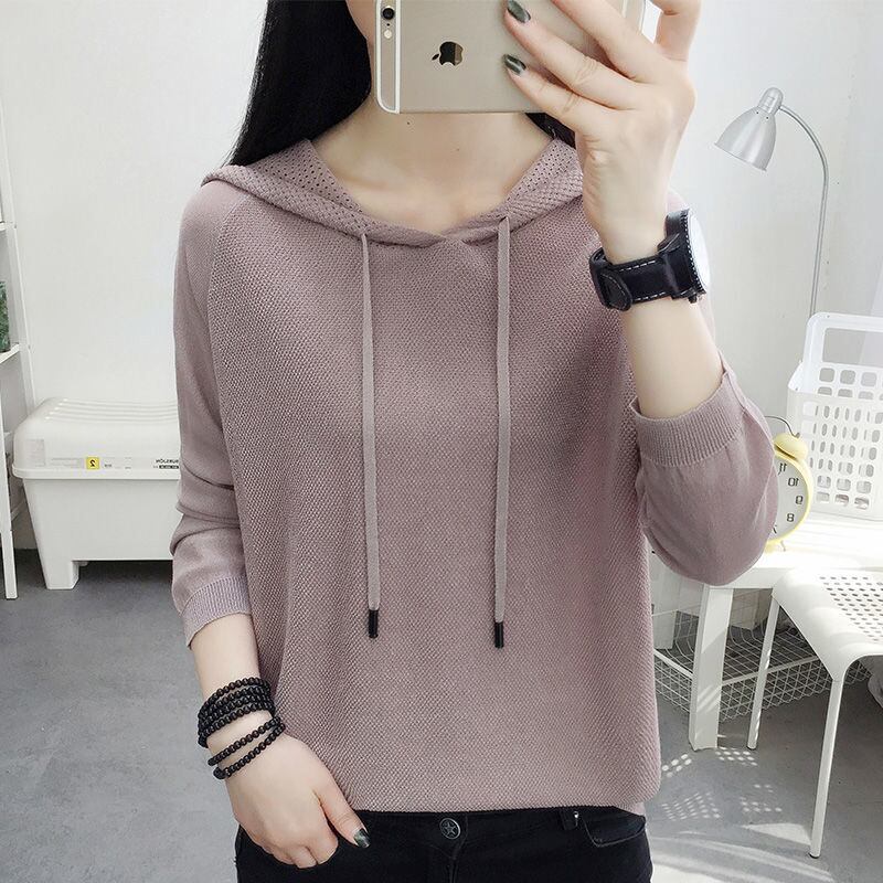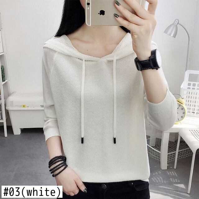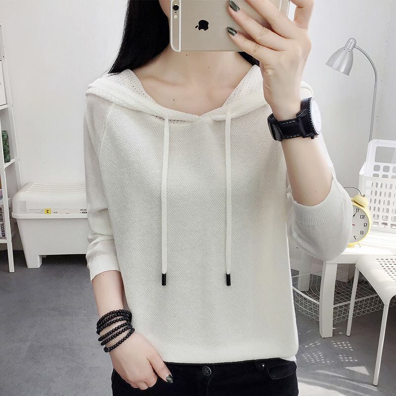 ニットフード付き Tシャツ女性 2022 中空アウト長袖 Tシャツ春薄型トップス服ソリッド Tシャツ ロング スプリング 春物 ソリッドカラー Son72880532996