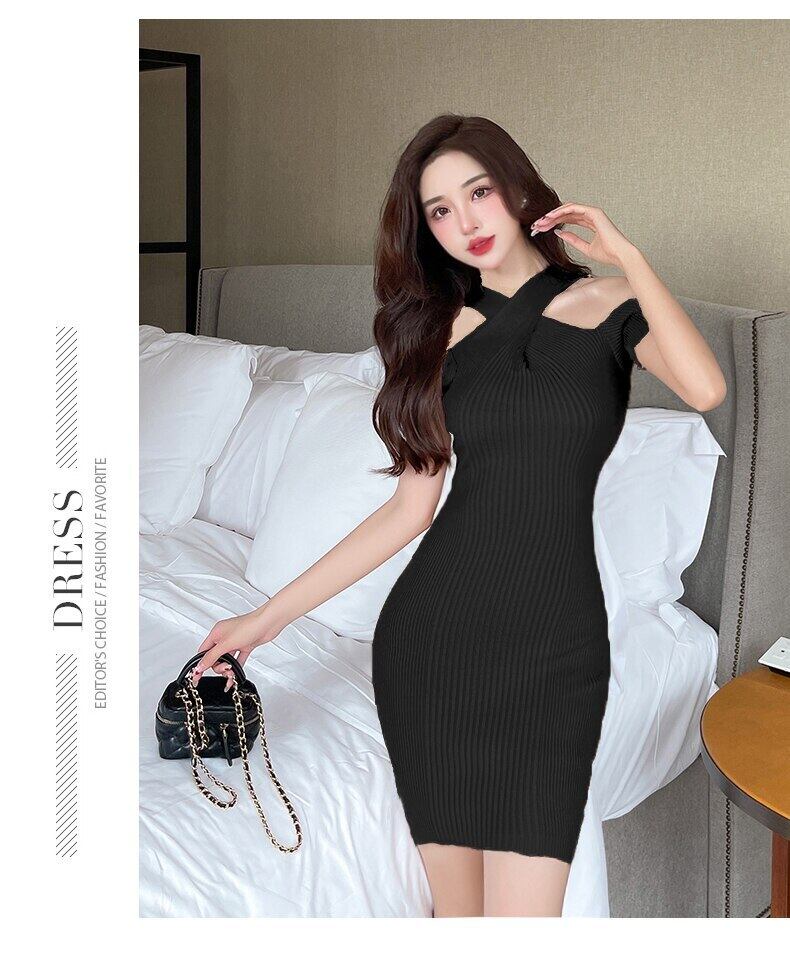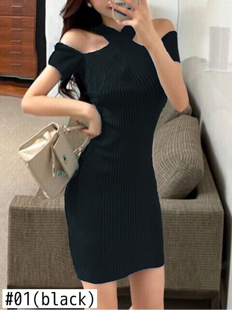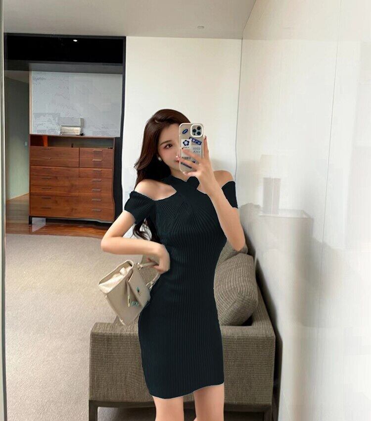 夏のドレスの女性 2022 セクシーなオフショルダードレスガール半袖薄型ニット黒ドレススリム弾性 ショート ブラック ハーフスリーブ エラスティック 伸縮 サマー 夏物 Son86144693444