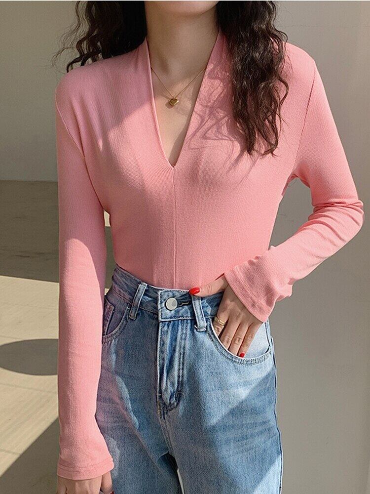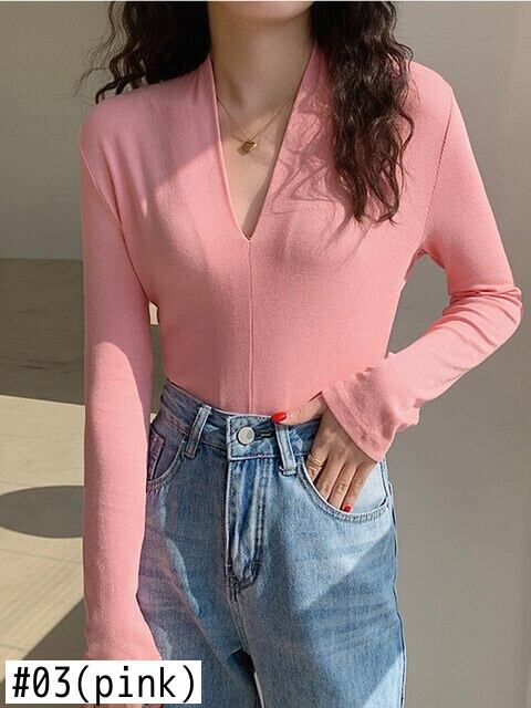 Tシャツセクシーなスリム V ネック長袖 Tシャツ女性 2022 春秋ピンクコットン Tシャツベーシックトップ ロング スプリング 春物 オータム 秋物 Vネック Son54049540684
