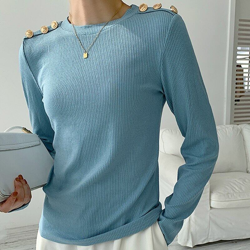 LJSXLS ボタン白 Tシャツコットントップス長袖 Tシャツ秋冬スタイルの女性 Poleras デモーダ ロング ホワイト オータム 秋物 ウィンター 冬物 Son20935122695