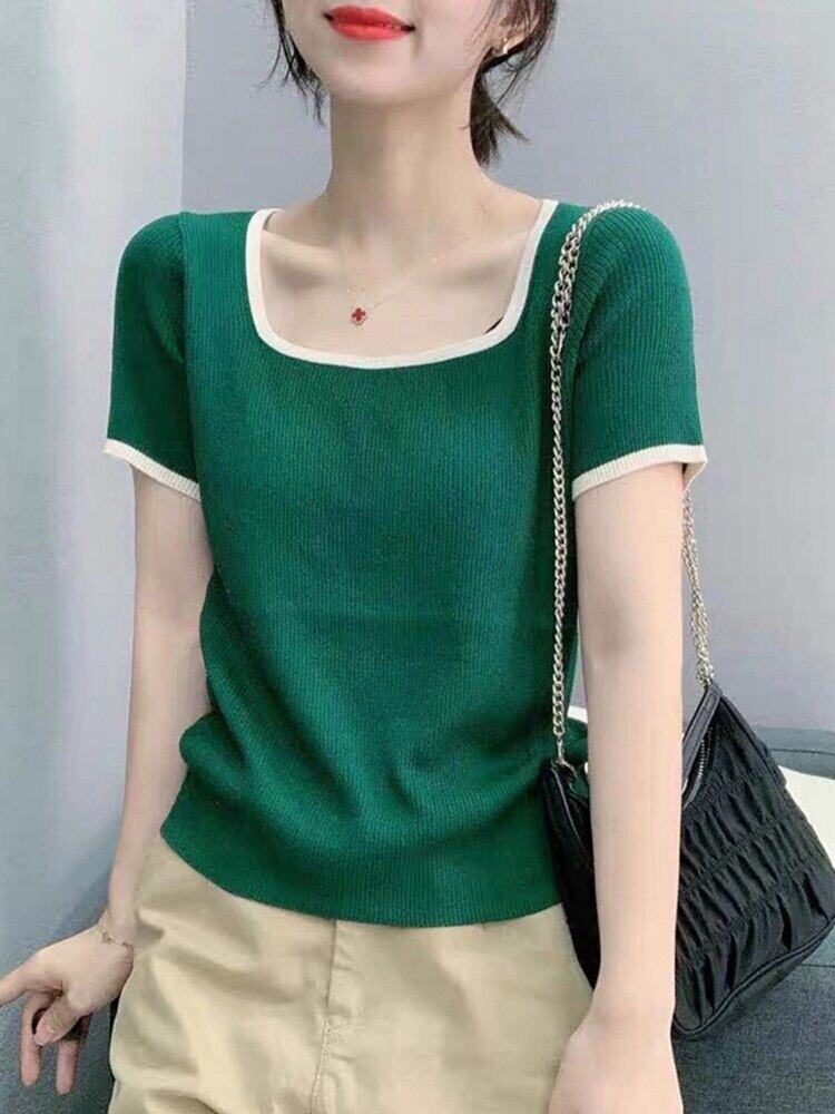 基本的な半袖 Tシャツ女性スクエアネック薄型スリム Tシャツ 2022 夏ニットトップ Tシャツ Camisetas デ ショート ハーフスリーブ サマー 夏物 スクウェア Son17414138753