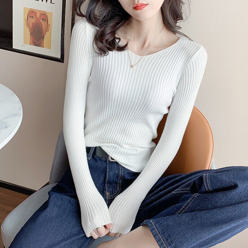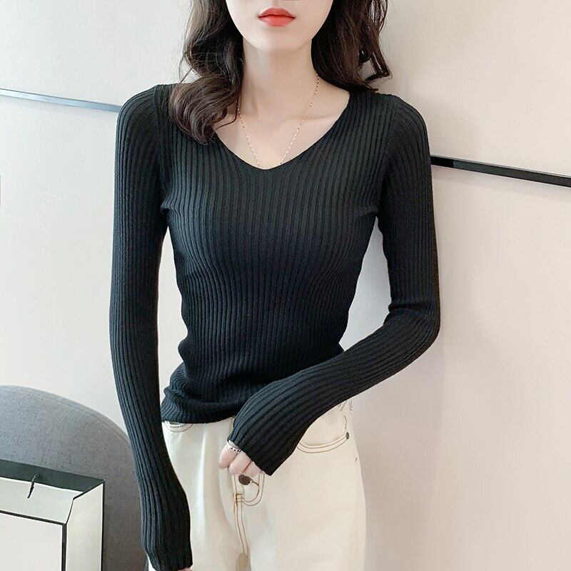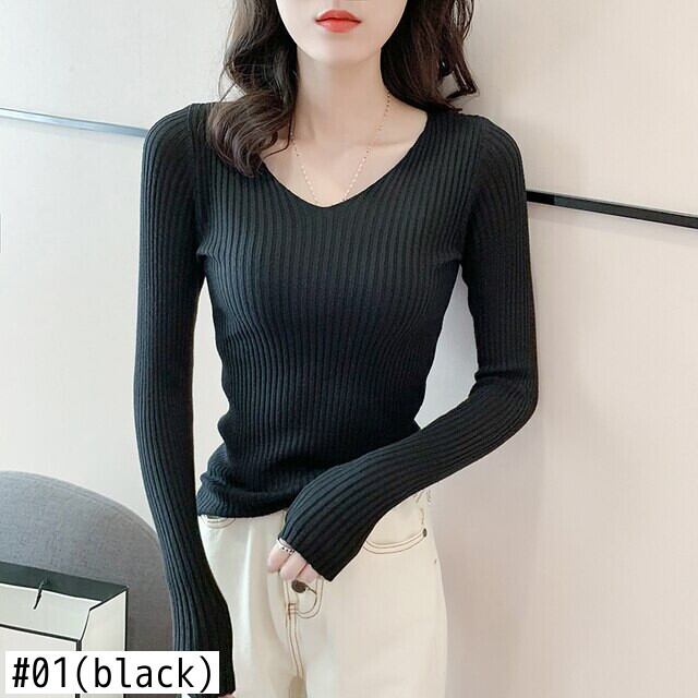 LJSXLS ソリッド V ネックプルオーバー女性セータースリムオールマッチ弾性 2021 春秋黒ニット長袖トップ ロング ブラック エラスティック 伸縮 スプリング 春物 オータム 秋物 Vネック ソリッドカラー Son21120574454