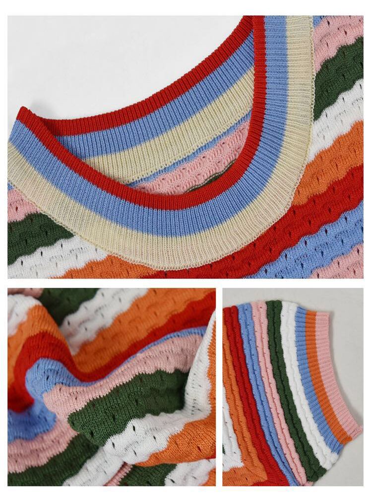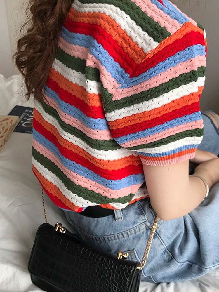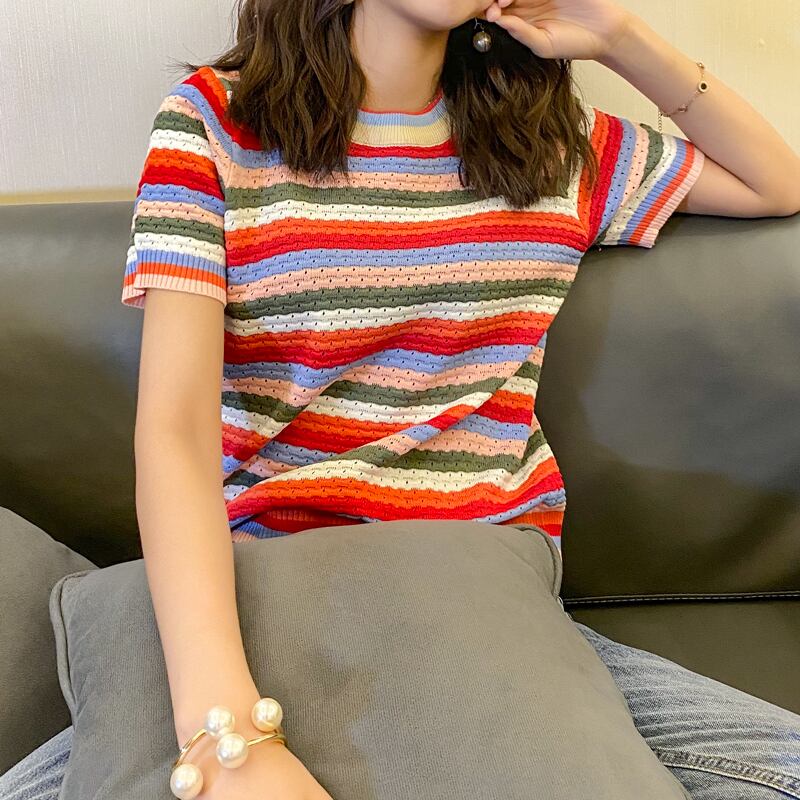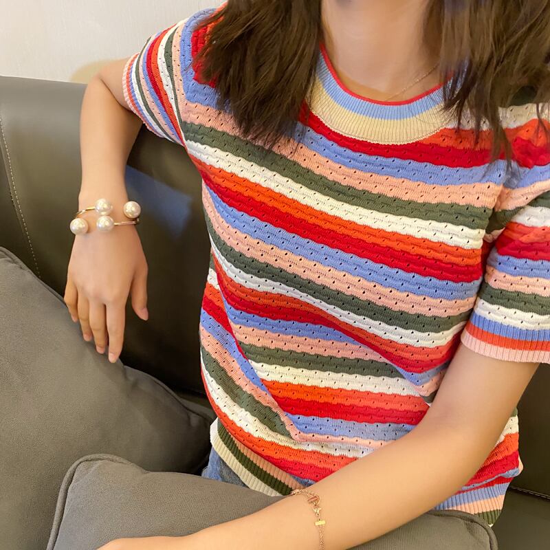 ストライプニット Tシャツ女性 2022 夏トップス中空アウト Tシャツ女性半袖 Tシャツ Camisetas ショート ハーフスリーブ サマー 夏物 Son42029519588