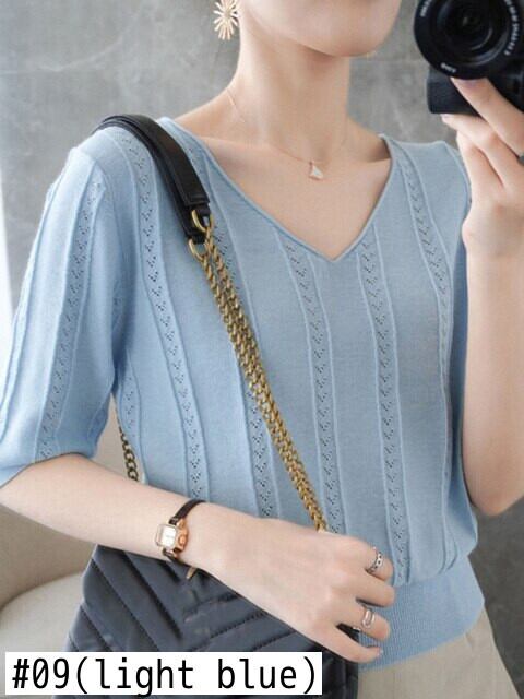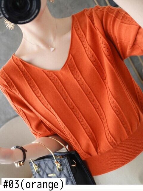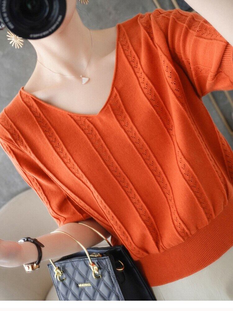 ニット中空アウトクロップトップ Tシャツ V ネック半袖 Tシャツストライプ Tシャツ女性の夏の女性の服 2022 トップス ショート ハーフスリーブ サマー 夏物 Vネック Son52648264681